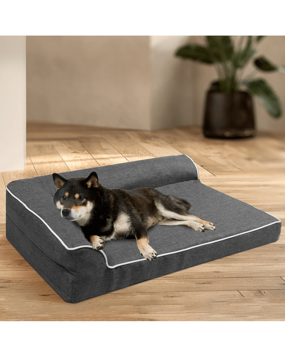 The unique L-shaped bolster sofa bed design offers additional support for your pet's neck and head, promoting deep, restorative sleep. The surrounding bolsters not only provide a sense of security but also allow your pet to snuggle comfortably and relax fully.