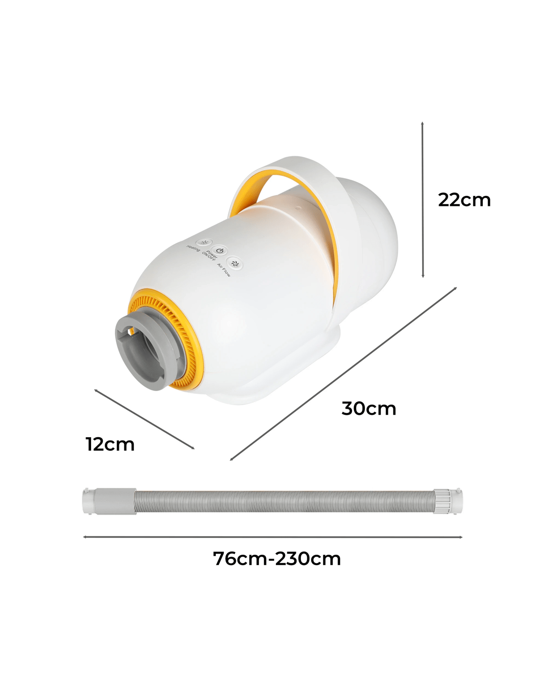 Looks like a vacuum cleaner but is actually a pet blow dryer. Just select the heat/speed setting and nozzle for your pet’s fur. Keep moving the nozzle over your pet until they are dried. Easy.