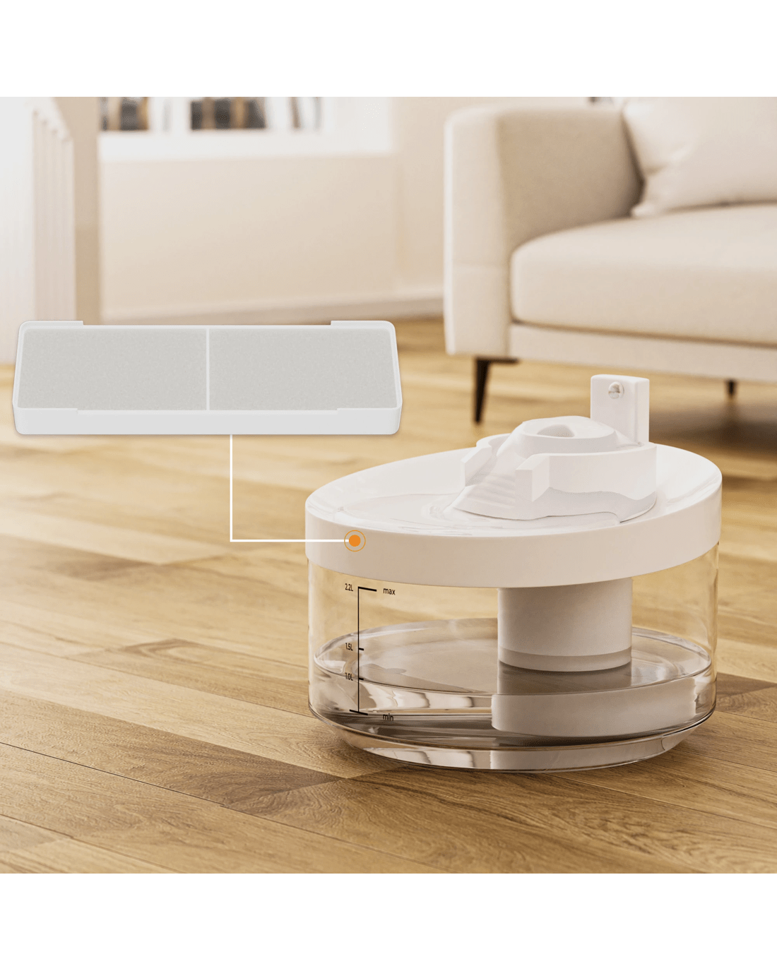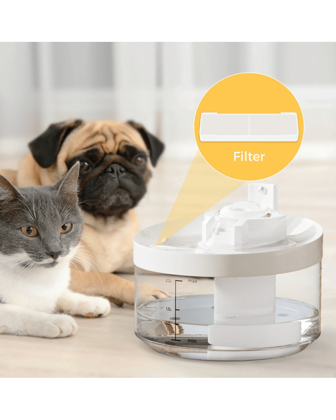 The water pump is equipped with an anti-dry-burn function that prevents damage in case of low water levels. The transparent water tank allows you to easily monitor the water level, ensuring your pet never goes without a drink. The 2.2L capacity provides plenty of water for extended periods, reducing the need for frequent refills.