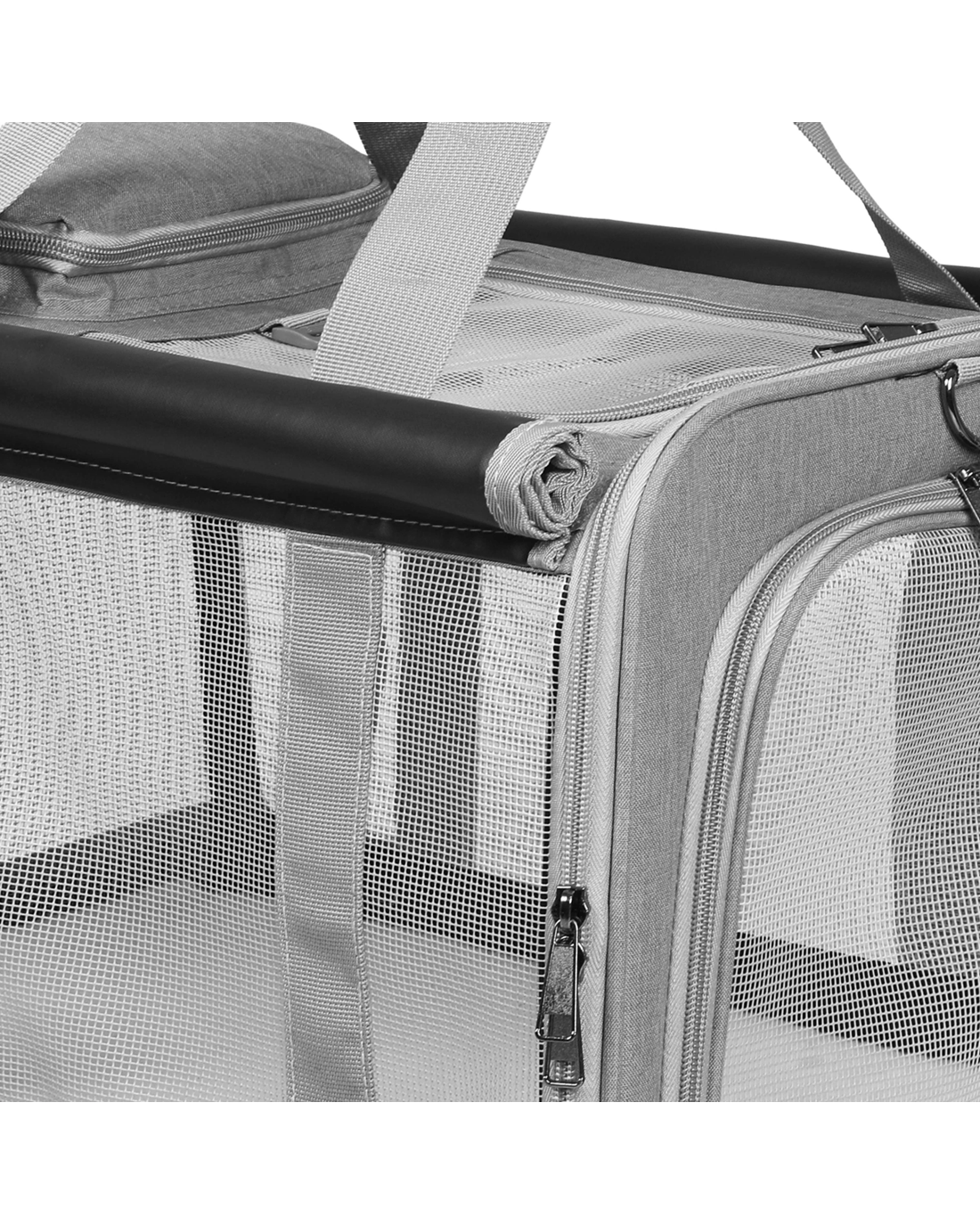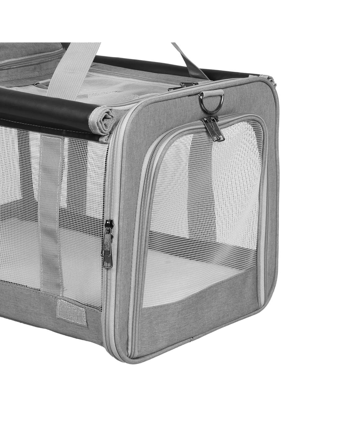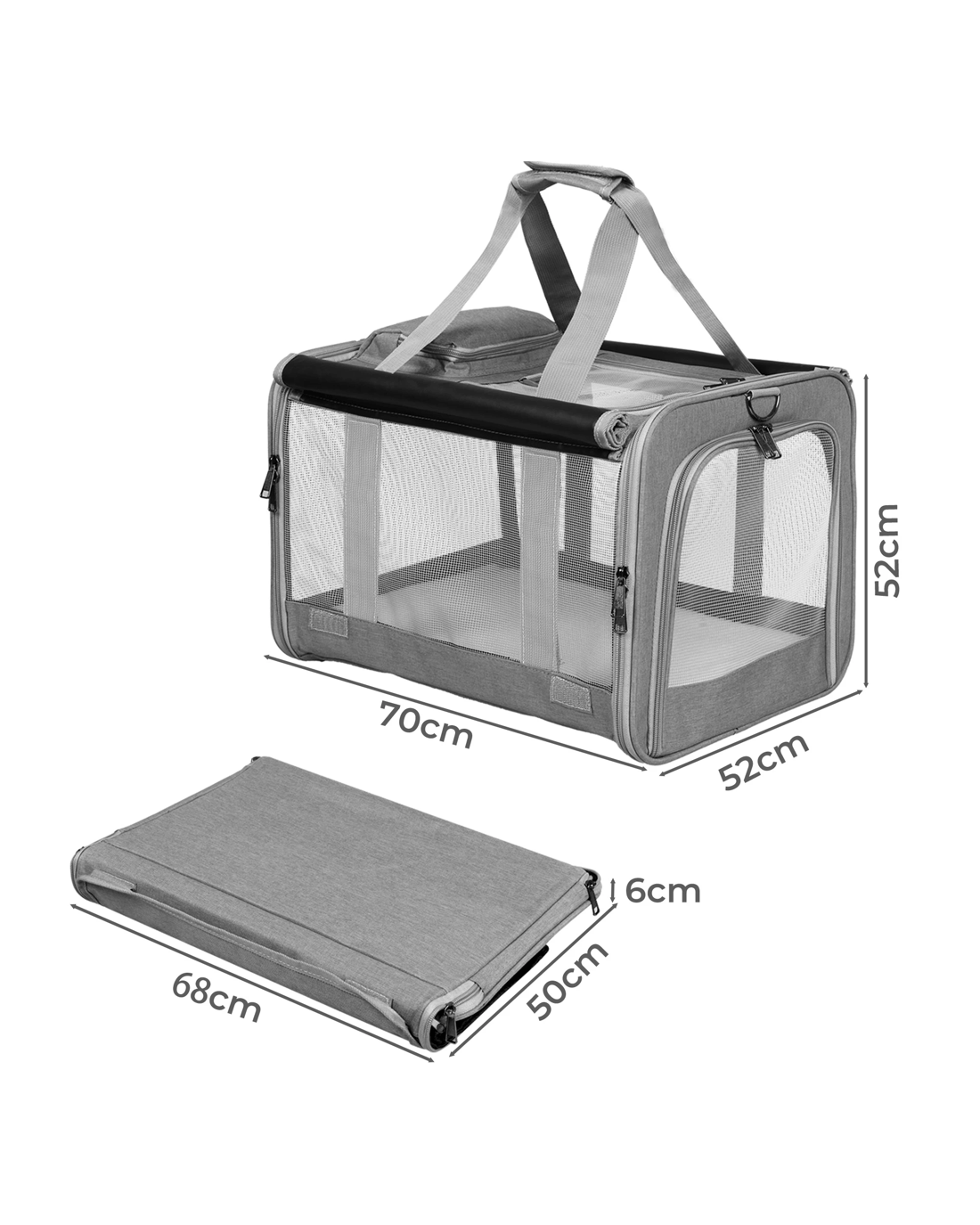 The four-sided mesh design with a roll-up curtain offers ventilation and a view for your pet, reducing their anxiety on outings. Foldable and just 6cm high when folded, it's easy to store and transport, fitting neatly in a closet, under a bed, or in the trunk of your car.
