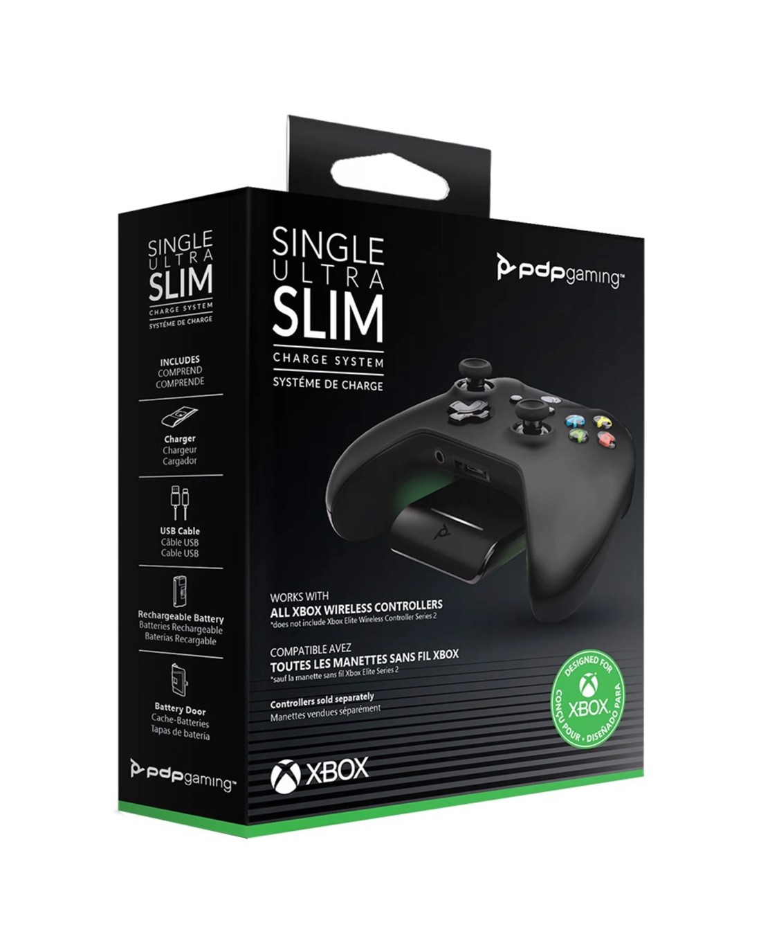 Cinematic, auto-dimming lights adapt to surrounding conditions to be less intrusive in the dark. An LED indicator on the front shows you the charge status of the controller by moving while charging and remaining static when fully charged. The Single Ultra Slim Charge System is officially licensed by Xbox and comes with one rechargeable battery and battery door*.
