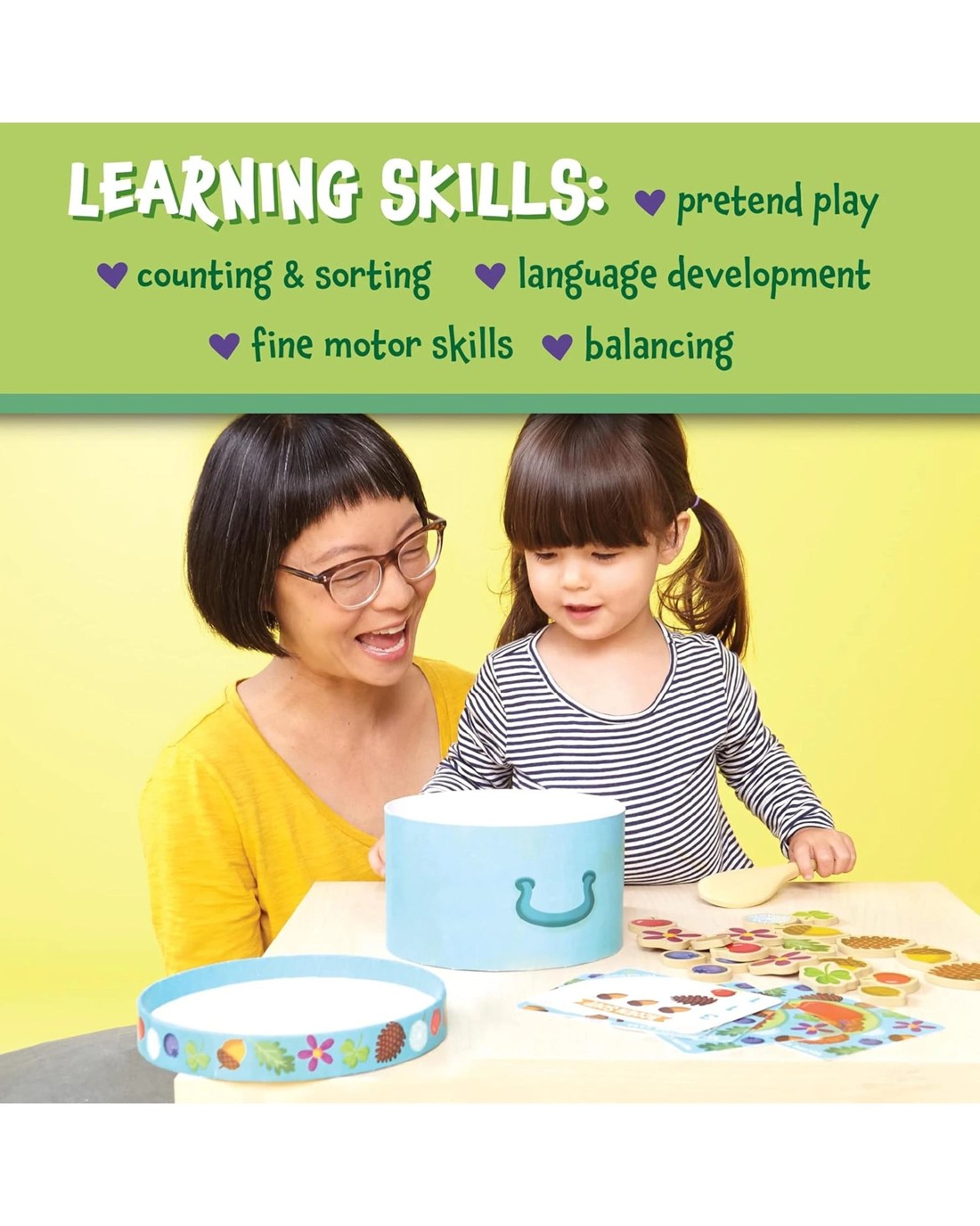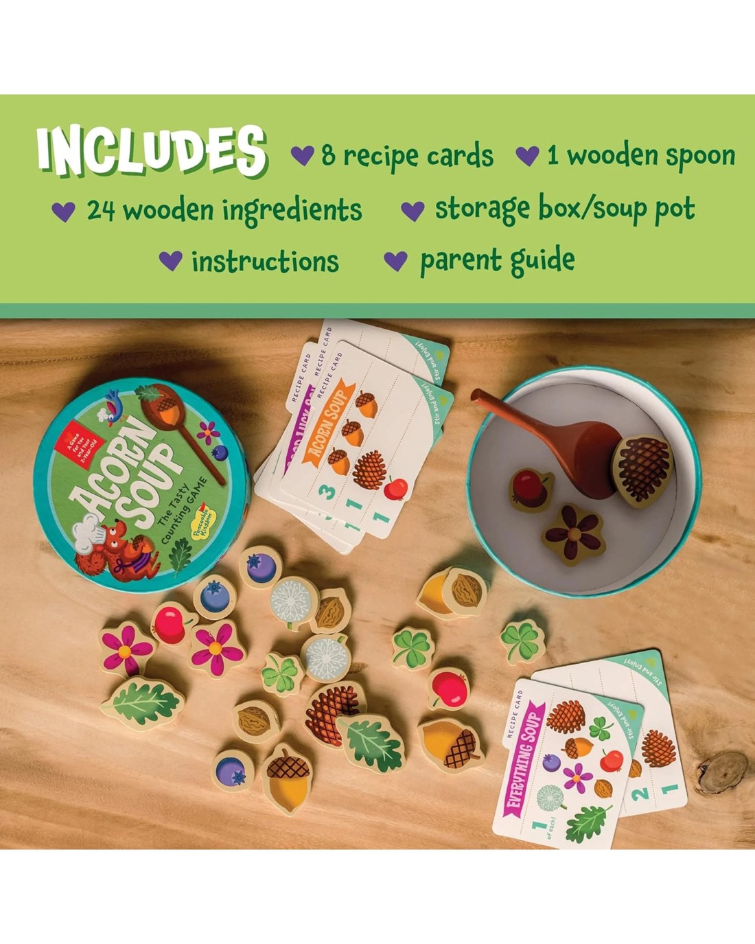 ACORN SOUP: Squirrel likes to store extra food for the winter. In this game, you and your toddler will help Squirrel make yummy soups by following the included recipe cards!PLAY AND LEARN: Acorn Soup is designed so that your young child will experience what it's like to take turns, play within the rules (even loosely!), and possibly learn a new skill like rolling die.FAMILY FUN: Inspire kindness in the family with meaningful board games, toys, & activities. This game will help build vocabulary & develop fine motor skills like balancing & hand-eye coordination.DETAILS: This game includes 8 recipe cards, 1 wooden spoon, 24 wooden ingredients, instructions, and a parent guide. Play with children ages 2 years old and up.COOPERATIVE TEAMWORK: Teach boys and girls about cooperation with meaningful board games, toys, and educational activities. Kids can play as a team and learn as they cooperate together.Contents
