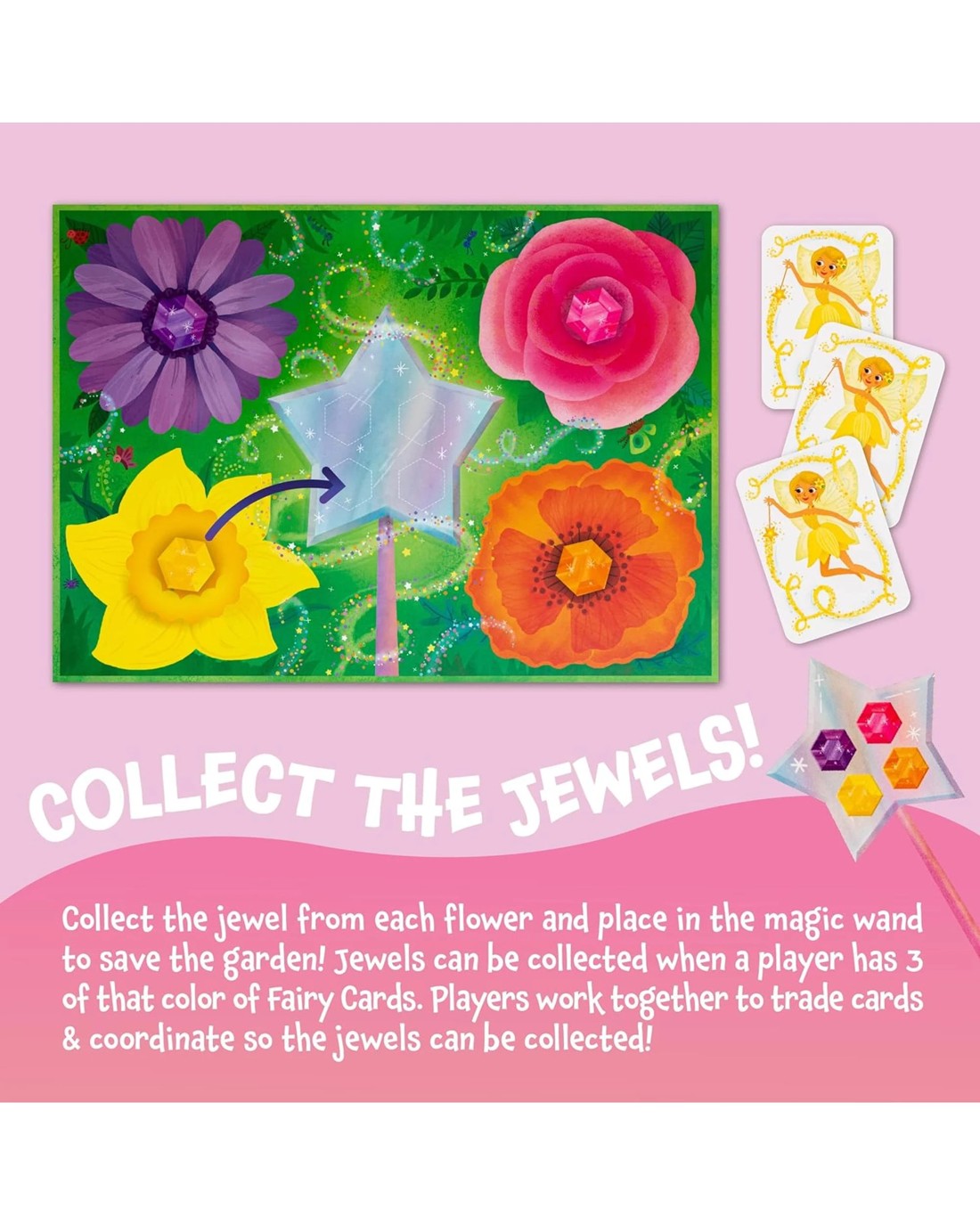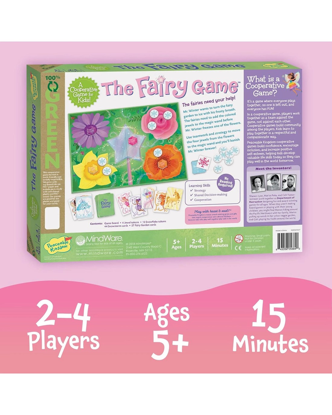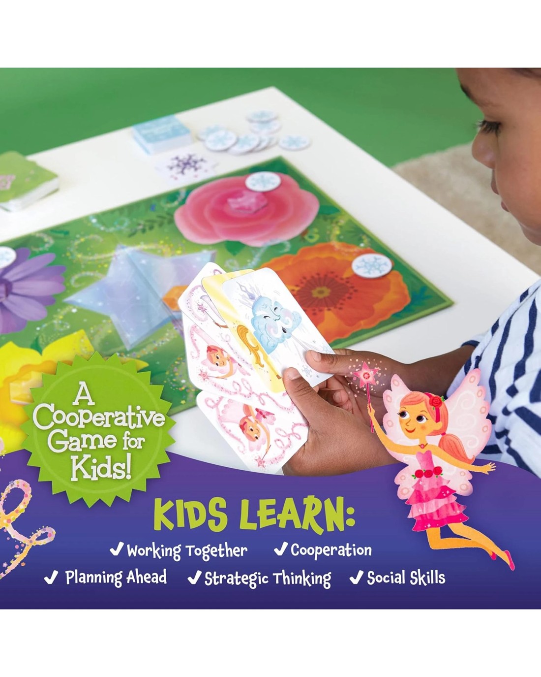 CAN YOU HELP THE FAIRIES: Mr. Winter is trying to freeze the fairies' treasured flowers! Cooperate together to match Fairy Cards to gather the hidden Magic Gems before 4 snowflakes land on one flower.LEARNING AND GROWING: In this matching and gathering game, kids learn simple strategy, following directions & taking turns and valuable social skills. No reading required allows littles to play too.BENEFITS: Cooperative games cultivate emotional development, shared decision making, positive self esteem, creative problem solving and develop a sense of community in a non-stressful play environment.HOW TO PLAY: Special cards allow players to slow down Mr. Winter's chill. Work together to fill the fairies' magic wand and banish Mr. Winter from the garden! Different card combos keep the game fun.WHO CAN PLAY: 2-4 players ages 5 and up can enjoy the Fairy Game.INCLUDES: Game board, 4 jewel tokens, 13 snowflake tokens, 44 snowstorm cards and 57 fairy garden cards.Contents