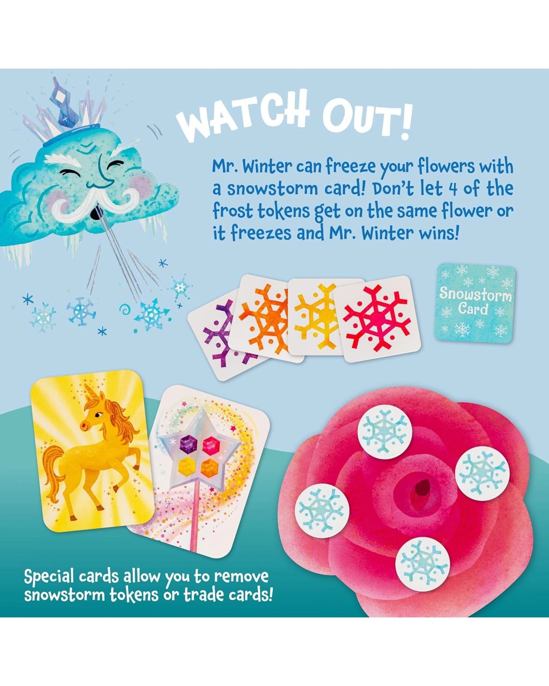 Mr. Winter is trying to freeze the fairies' treasured flowers! Cooperate together to match Fairy Cards to gather the hidden Magic Gems before 4 snowflakes land on one flower. Ages: 5 + | Players: 2 - 4 | Playtime: 15 Mins