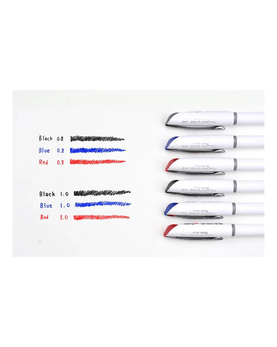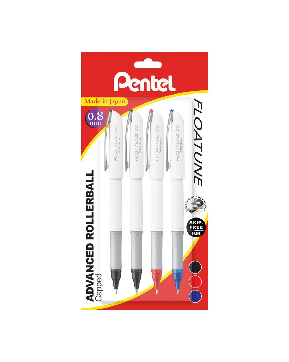 This Pentel Floatune rollerball pen set includes four pens with a smooth 0.8 mm tip and advanced ink technology for skip-free writing. Each pen uses water-based ink with an oil-based lubricant for consistent, fluid strokes under any pressure. Plus, they include a latex-free grip for added comfort.
