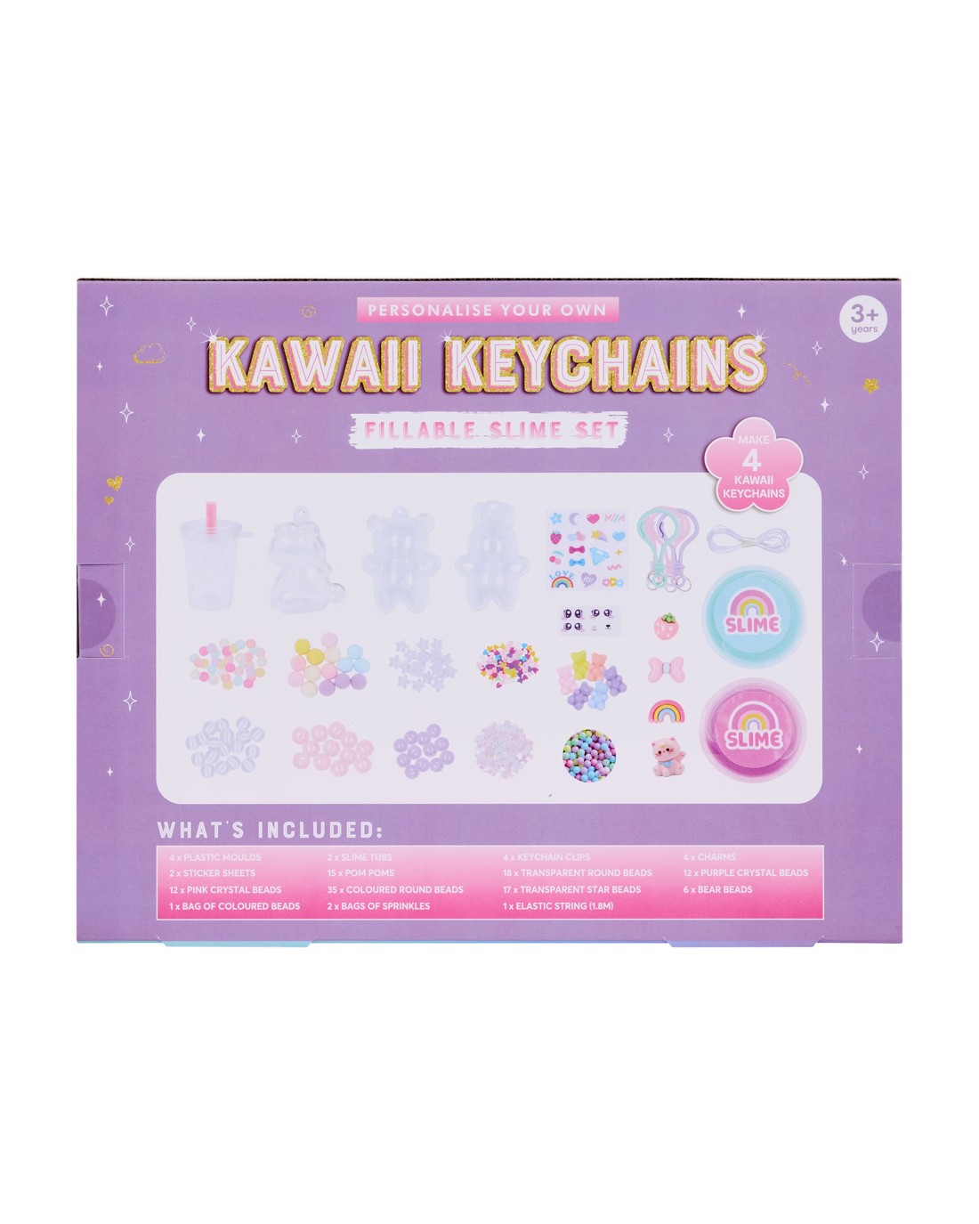 - Includes 4 x plastic moulds, 2 x slime tubs, 4 x keychain clips, 4 x charms, 2 x sticker sheets, 15 x pom poms, 18 x transparent round beads, 12 x purple crystal beads, 12 x pink crystal beads, 35 x coloured round beads, 17 x transparent star beads, 6 x bear beads, 1 x bag of coloured beads, 1 x bag of sprinkles, 1 x elastic string