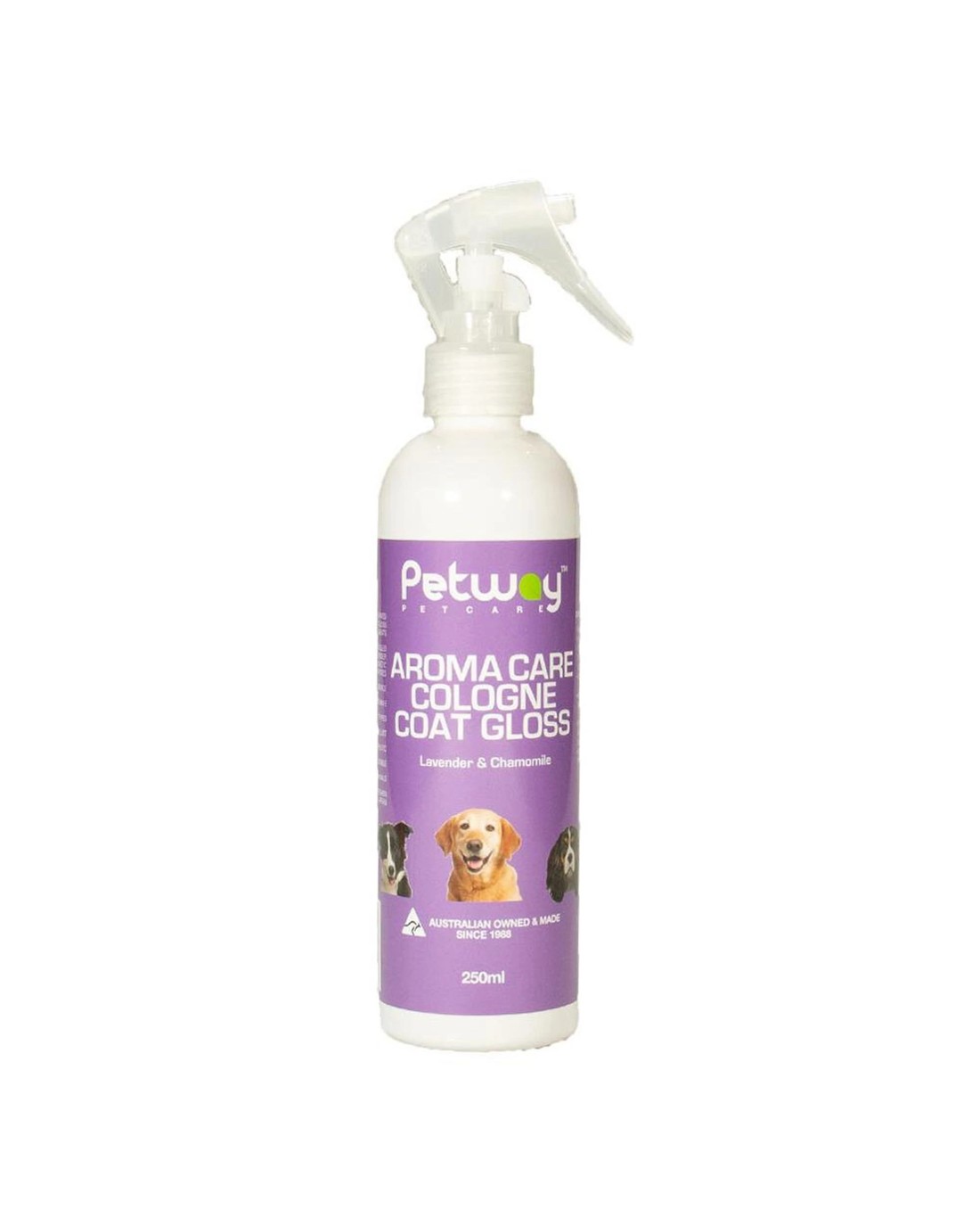 Petway Petcare Aroma Care Cologne Coat Gloss a naturally based cosmetic cologne and coat gloss. Cotains pure steam distilled essential oils of Lavender and Chamomile for fragrance purposes, also contains Vitamin E. Adds shine to the coat and promotes lustre, leaving a beautiful aromatic fragrance. Refreshens coat between washes and may also be used to freshen animals bedding and living areas.