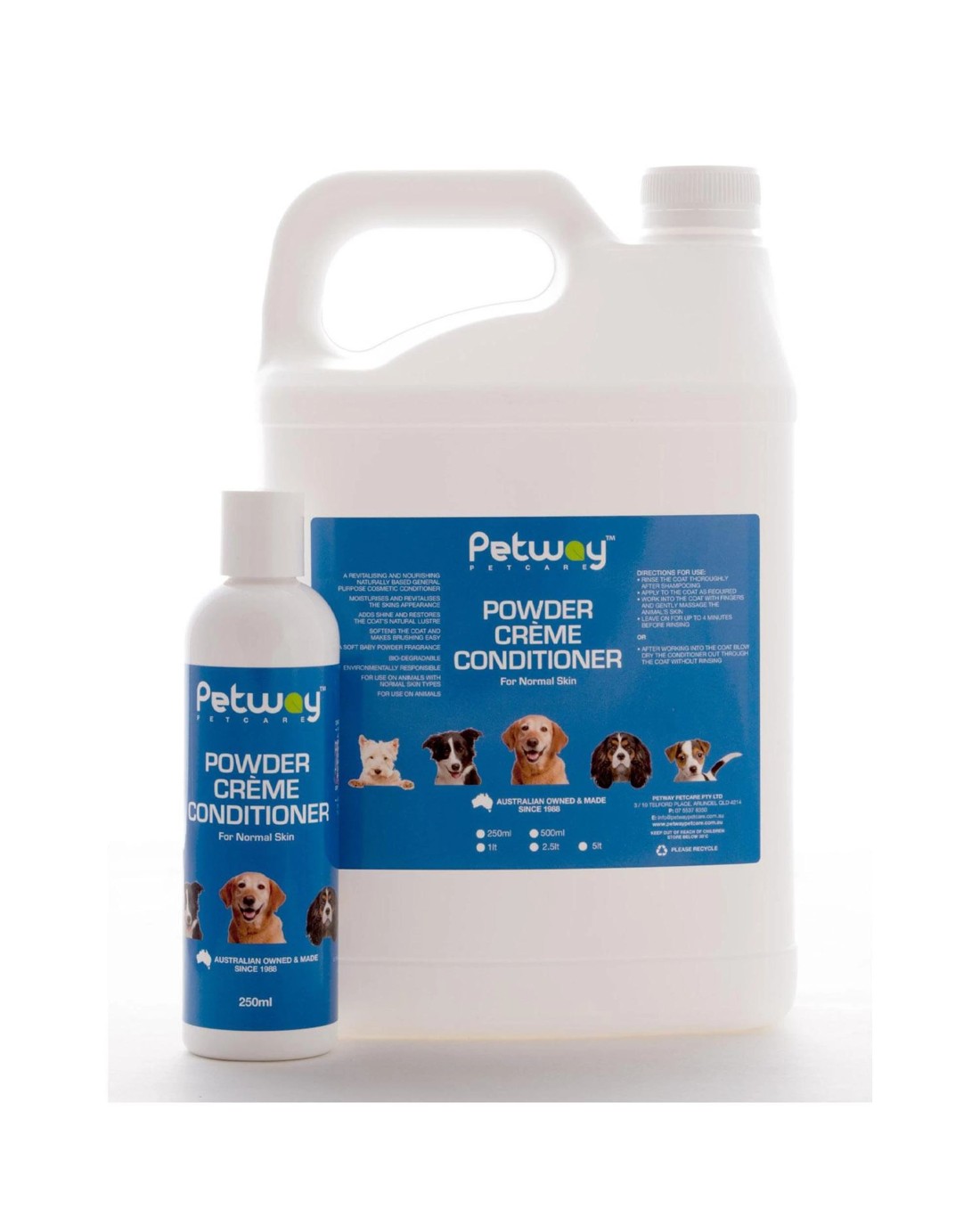 Petway Petcare Powder Crème Conditioner a revitalizing and nourishing naturally based, general purpose cosmetic conditioner for normal skin types, that adds shine and restores the coats natural lustre, while invigorating the skin. It will soften the coat and make brushing easy. Easily rinsed out or can be blown out through the coat with dryer. Leaves a soft baby powder fragrance that matches our popular Petway Petcare Wicked White Whitening & Stain Removal Shampoo and our Powder Cologne Coat Gloss; however, it can be used in conjunction with all Petway Petcare Shampoos.