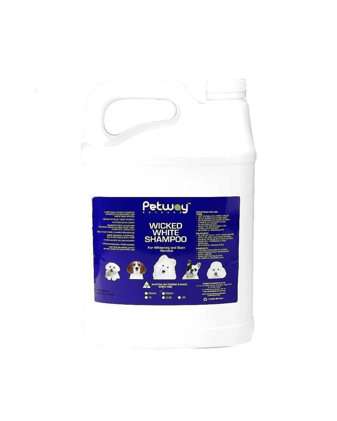 Petway Petcare Wicked White Whitening & Stain Removal Shampoo a naturally based cosmetic shampoo concentrate for white coat breeds, specifically formulated for more advanced whitening. It contains a stain removing agent and is blue in appearance, which whitens white coats and assists in reducing dirty stains and unsightly stains caused from tear, urine and licking. While whitening the coat, it also provides a deep cleanse to the coat and skin. Leaves no blue/grey residue and a soft baby powder fragrance.