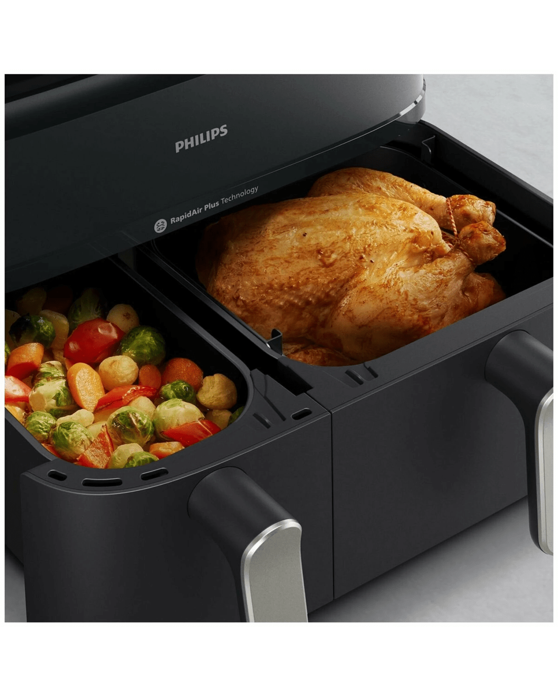 Dual Basket with Steam: Cook two dishes at once with different methods, including steama first for Philips Airfryers.