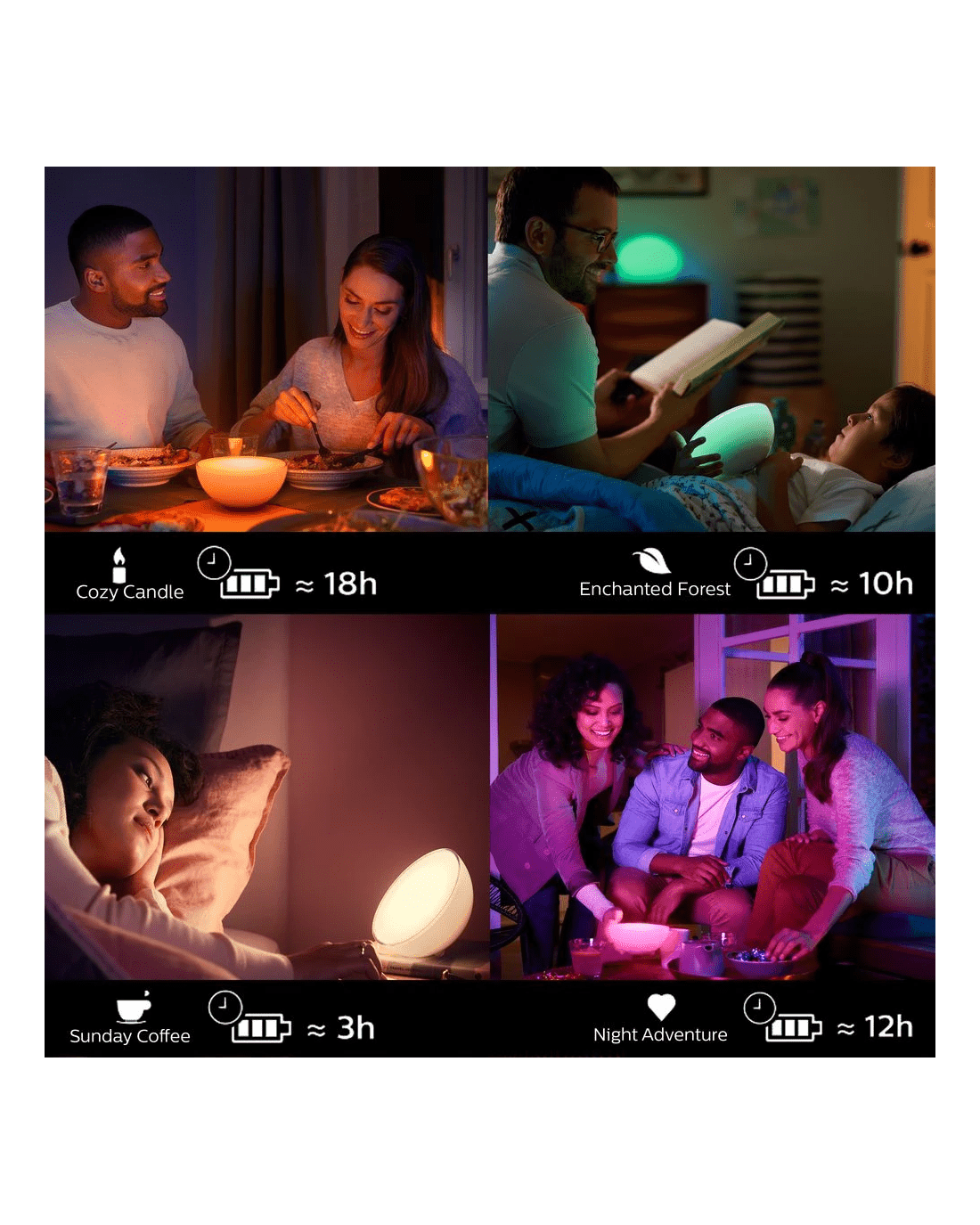 - You can enjoy up to 3 hours of brilliant smart lighting and up to 18 hours using the cosy candle Light effect.