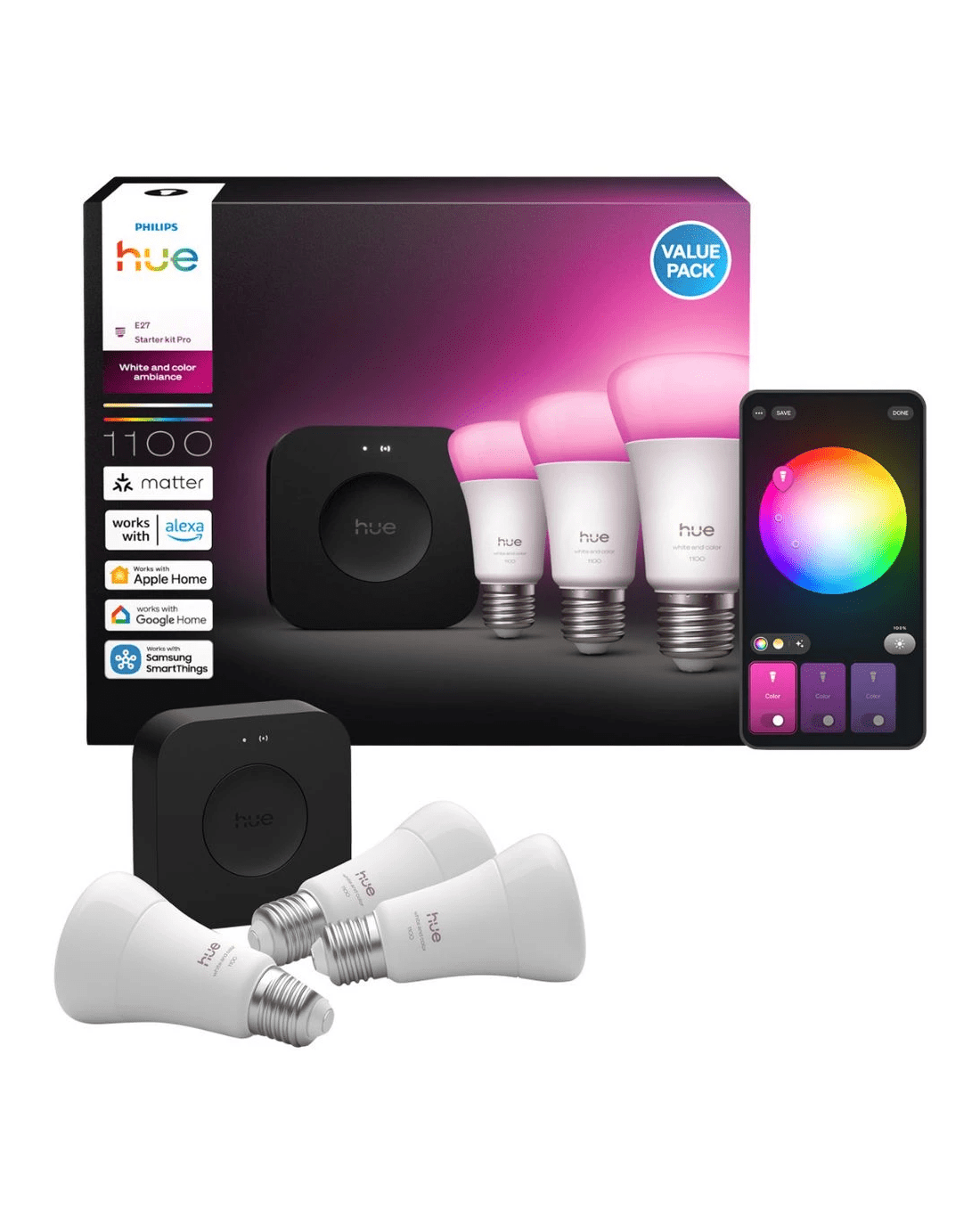 Philips Hue White and Colour Smart Bulb 11W A60 E27 3PK