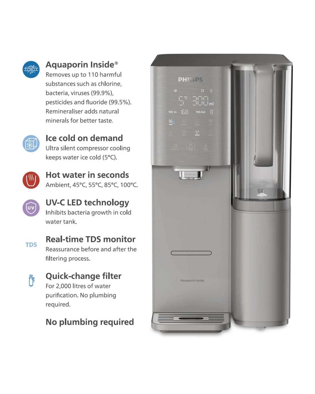 - Static UV-C LED technology activates every hour, preventing bacteria growth in the cold water tank.