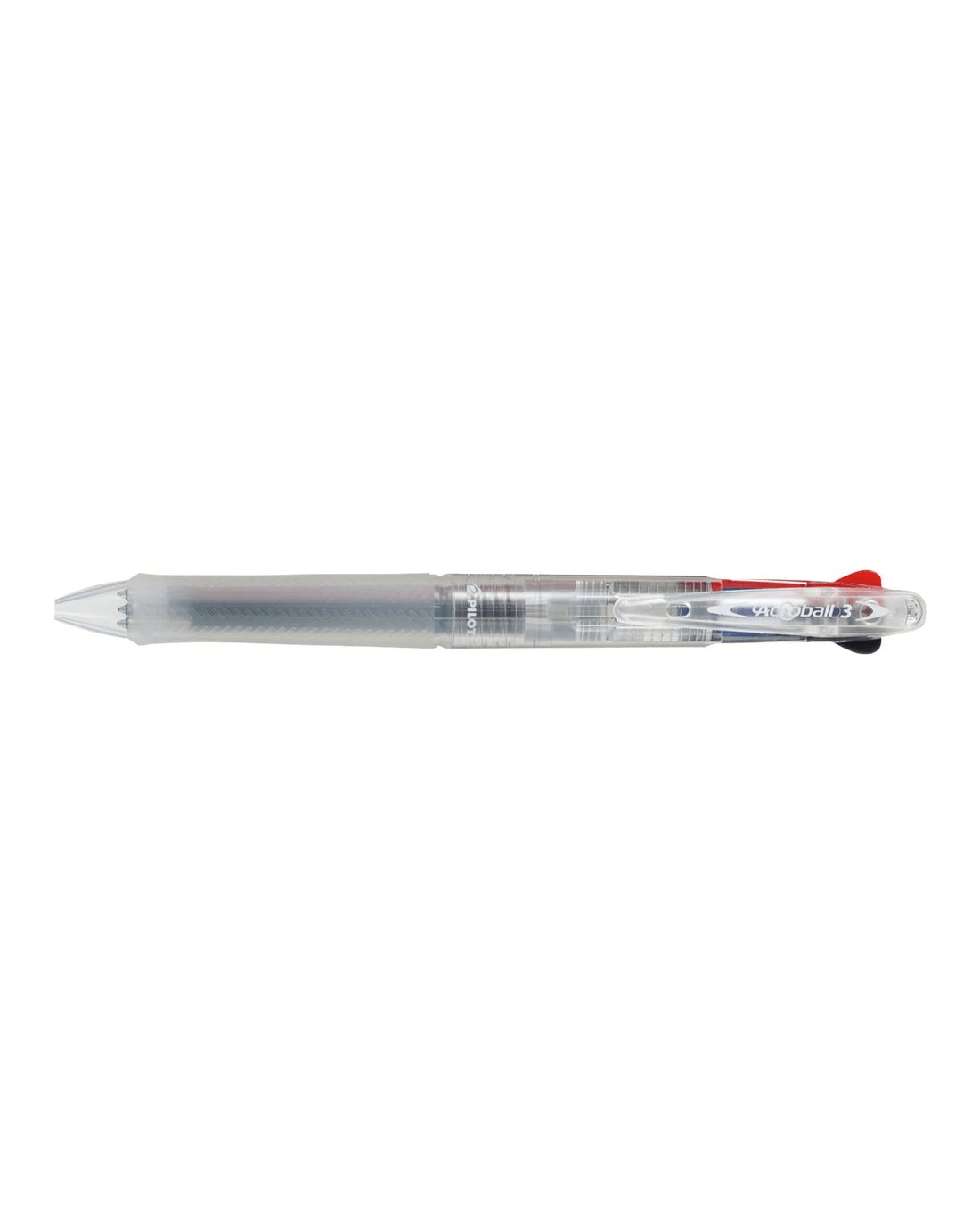 - The barrel is transparent and features black, blue and red ink colours.