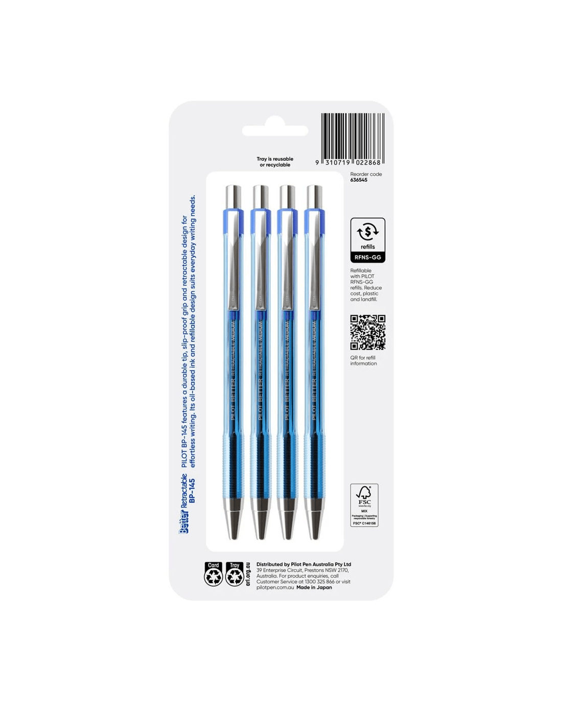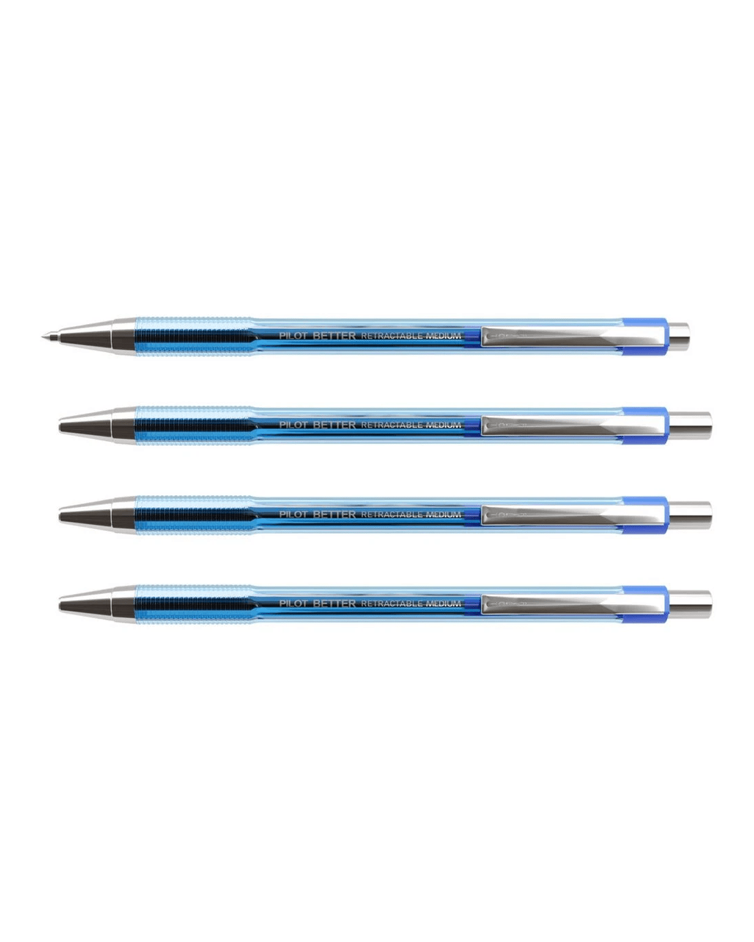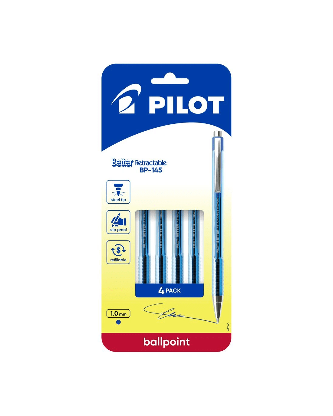 PILOT BP145 Retractable Ballpoint Pen Medium 1.0mm Blue 4 Pack delivers reliable performance for students and professionals alike. Each pen features a durable stainless steel tip, smooth oil-based ink and a refillable design, perfect for everyday writing. The 1.0mm medium tip provides bold, consistent lines with a smooth flow, ideal for expressive writing and extended note-taking. The slip-proof ribbed grip ensures all-day comfort, while the retractable mechanism and sleek pocket clip offer convenience and portability. This pack includes four Blue pens, each refillable with PILOT RFNS-GG refills for a cost-effective solution.
