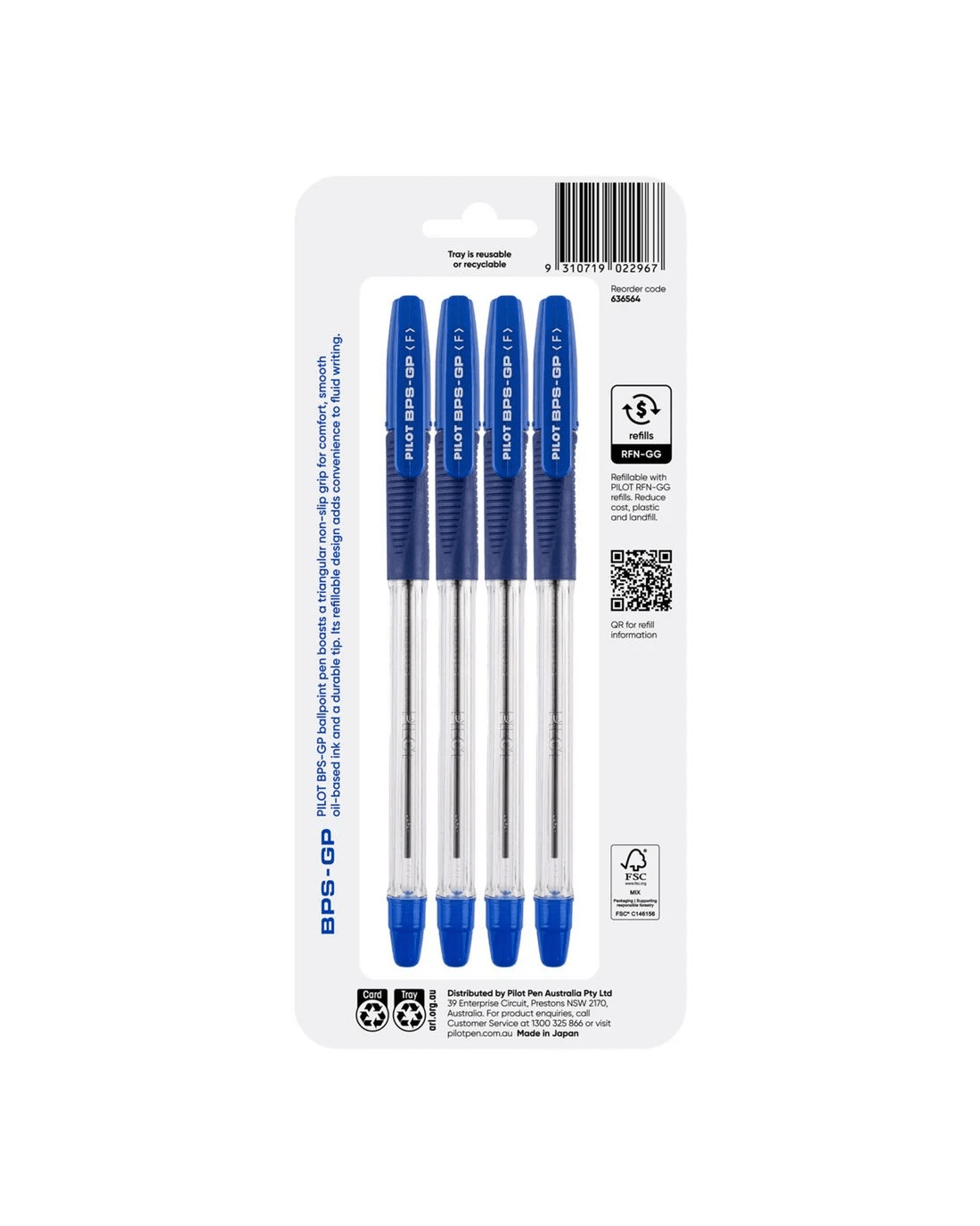 PILOT BPSGP Ballpoint Pen Fine 0.7mm Blue 4 Pack is designed for comfort and long-lasting quality. Its fine 0.7mm tip produces crisp, clean lines, ideal for note-taking and journaling. The smooth, oil-based Blue ink delivers a steady writing flow, while the durable steel tip ensures long-lasting use. A triangular non-slip grip enhances control and comfort during extended writing sessions, making it perfect for students and professionals. This pack contains four Blue pens. Each pen is refillable with PILOT RFN-GG refills, offering a cost-effective choice.