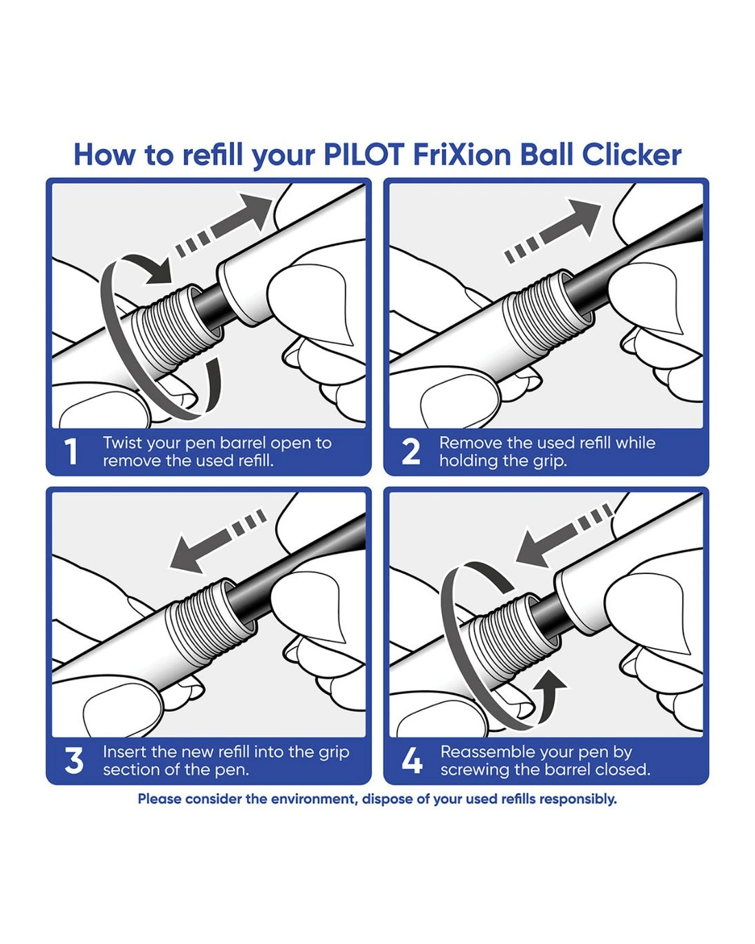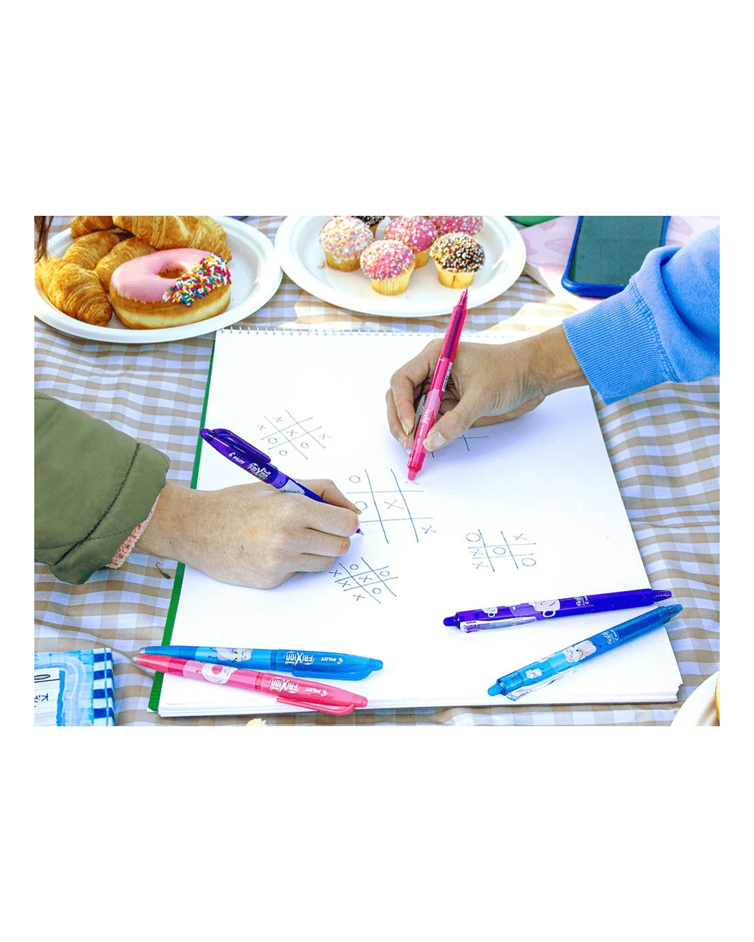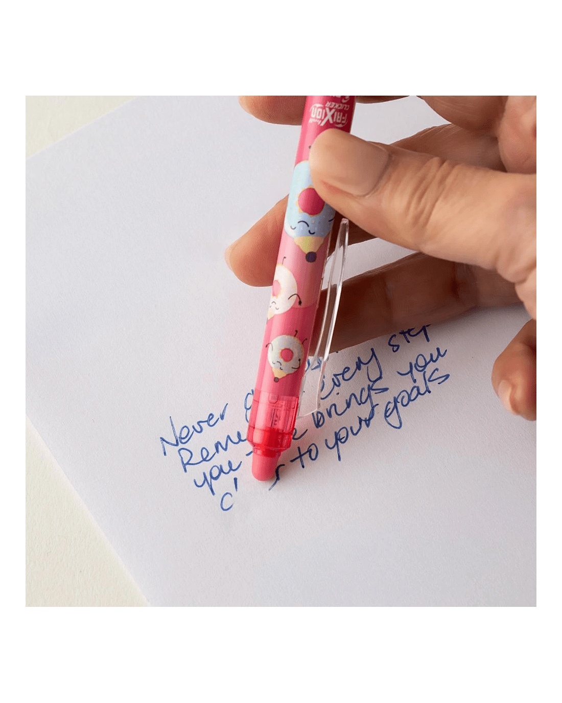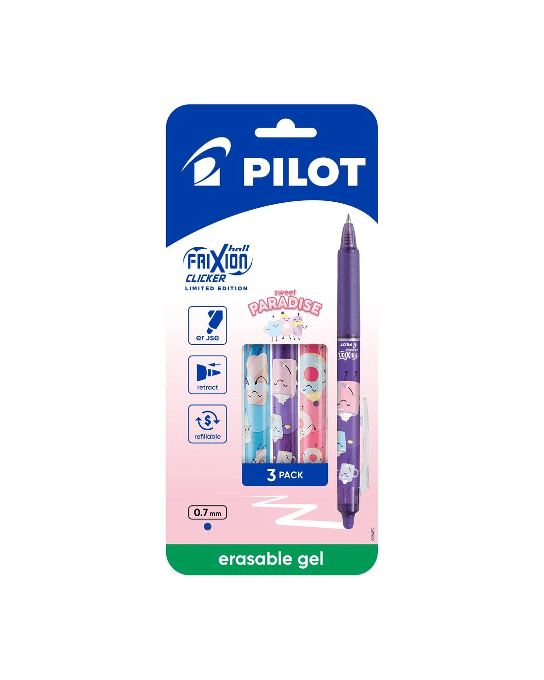 PILOT FriXion Clicker Limited Edition Sweet Paradise Erasable Gel Pen 0.7mm Blue Ink 3 Pack adds a delightful twist to everyday writing. Featuring three playful characters—Dizzy Donut, Choco Hug and Fluffy Mallow, each pen is designed to make studying and note-taking more fun. With a 0.7mm tip and smooth Blue gel ink, these pens are perfect for schoolwork, journaling, or creative doodles. Thanks to PILOT’s unique thermo-sensitive ink, you can write, erase and rewrite without any mess—no correction tape or fluid needed. This pack includes three FriXion Clicker Blue pens. The pens are refillable with PILOT BLS-FR refills, offering a cost-effective solution.