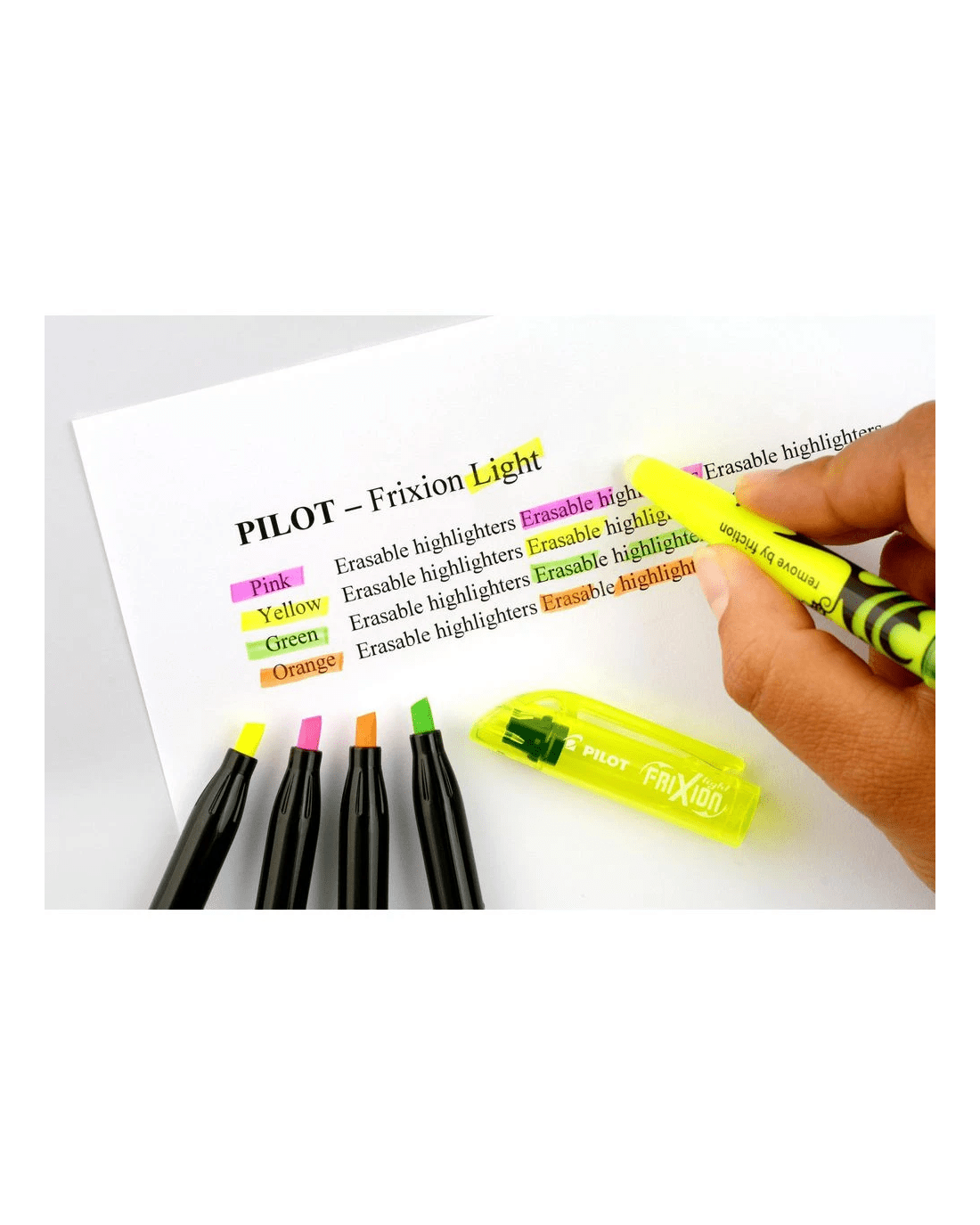 PILOT Frixion Highlighters have a unique design which allows you to highlight, erase and highlight again. Use the rubber tip on the end of the highlighter to erase the ink and you can re-write or highlight over the area right away.