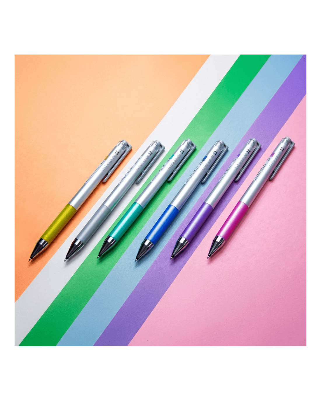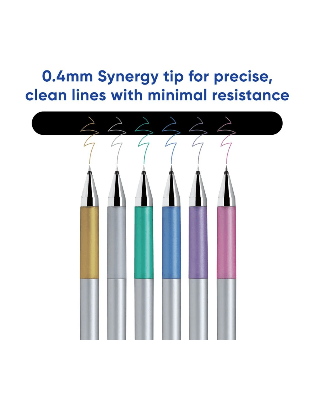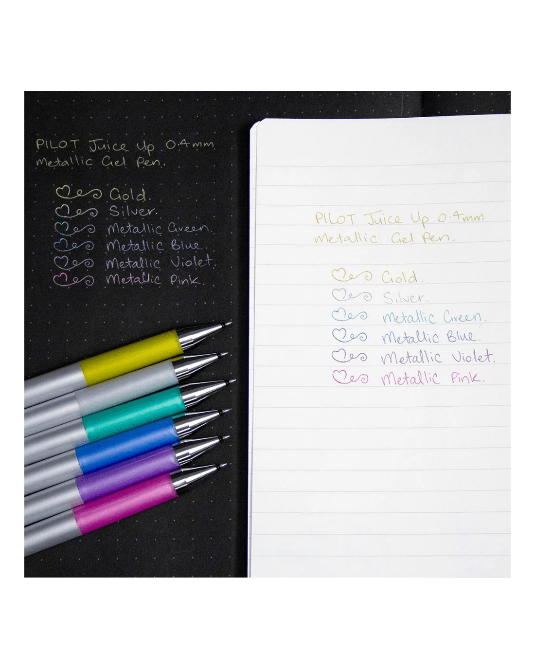 PILOT Juice Up Retractable Metallic Gel Pens are ideal for journals, planners, and diaries, this assorted 6 pack includes a mix of metallic colours to spark creativity and keep you organised. Each pen uses fade- and water-resistant pigment ink, so your notes stay neat and lasting. With PILOT’s Synergy Tip, you get the strength of a cone tip and the precision of a needle tip, delivering smooth, consistent lines every time. Perfect for writing, sketching, or adding detail to your planner. This pack contains six colours: Gold, Metallic Blue, Metallic Green, Metallic Pink, Metallic Violet, and Silver.