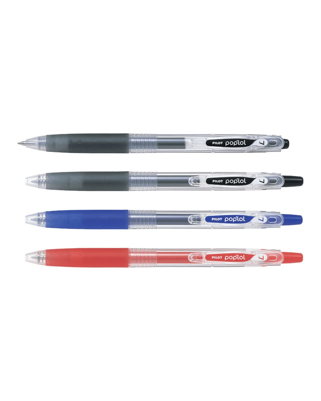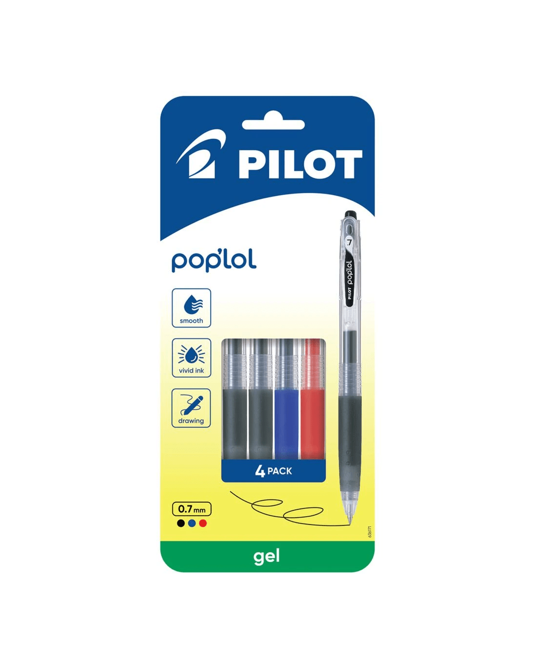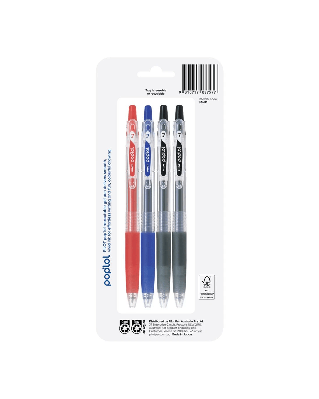 The PILOT pop'lol Retractable Gel Pen 0.7mm Assorted 4 Pack delivers smooth, vivid ink that’s ideal for note-taking, sketching, and drawing. Its fine 0.7mm tip ensures clean, consistent lines every time, while the pigment-based ink produces rich, lasting colour. Designed for comfort and convenience, each pen features a secure spring-loaded clip and an ergonomic grip for effortless writing. Perfect for students and artists alike, the pop’lol brings ease and creativity to everyday writing and creative projects. This pack comes with two Black, one Blue and one Red pen.