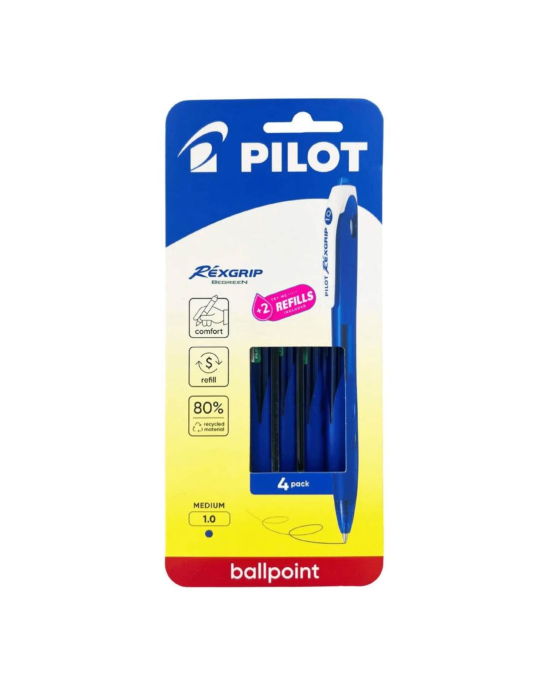 Sold by OfficeworksPILOT Rexgrip Ballpoint Pens 1mm Blue 4 Pack w/Refills