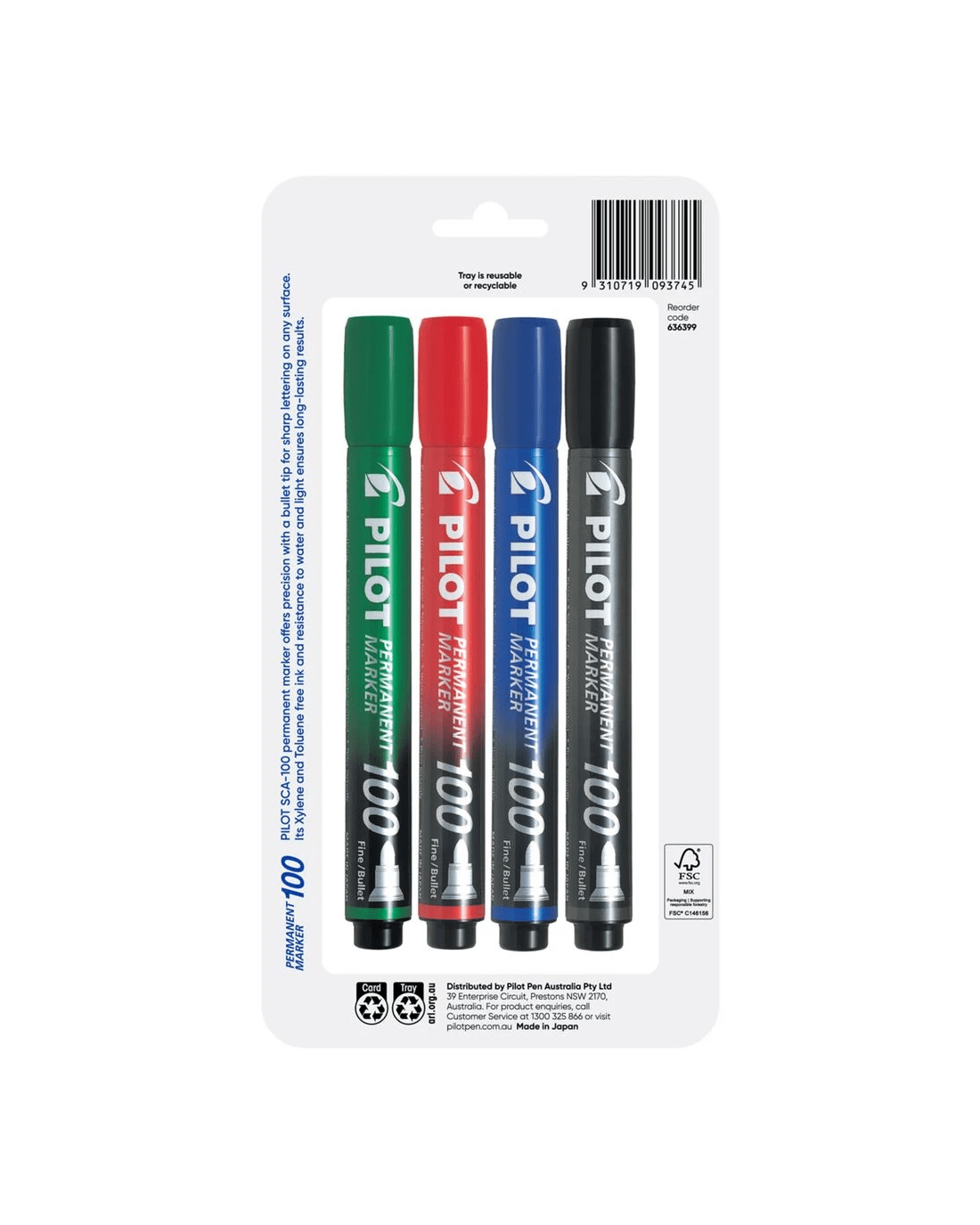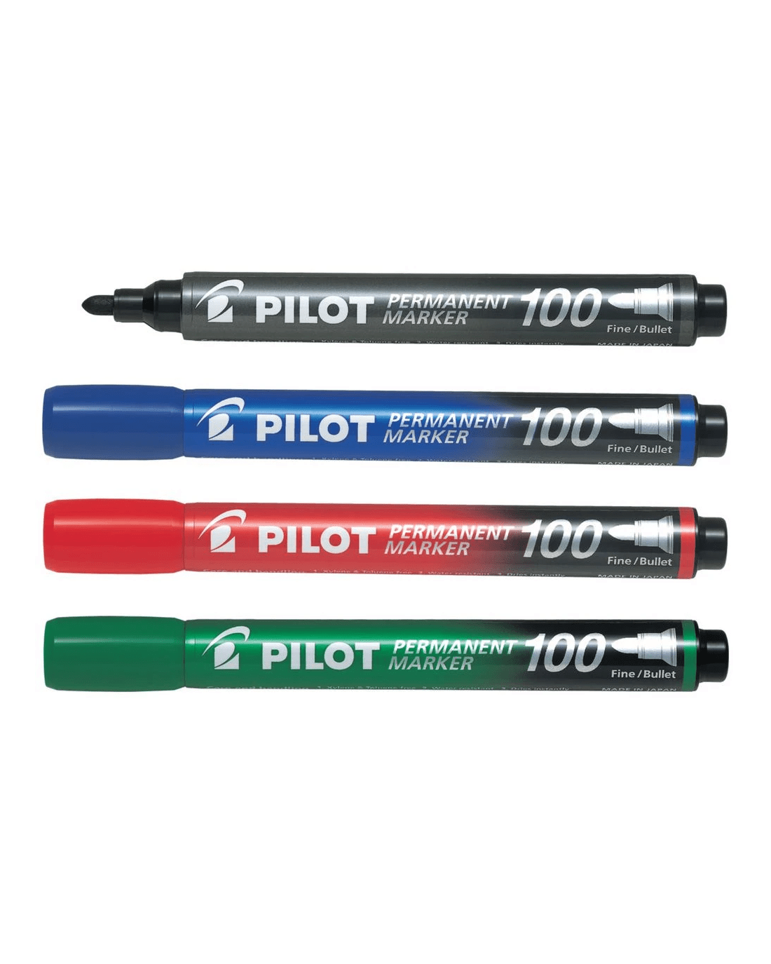 PILOT SCA100 Permanent Marker Bullet 1mm Assorted 4 Pack delivers reliable, long-lasting results across a variety of surfaces. Its vivid, fade-resistant ink creates strong, permanent marks on paper, cardboard, plastic and more. The durable bullet tip provides consistent, controlled lines—ideal for everyday labelling, writing, and general-purpose use. With a 24-hour cap-off time, the marker resists drying out quickly, ensuring it’s ready when you need it. This pack includes one Black, Blue, Red and Green marker.