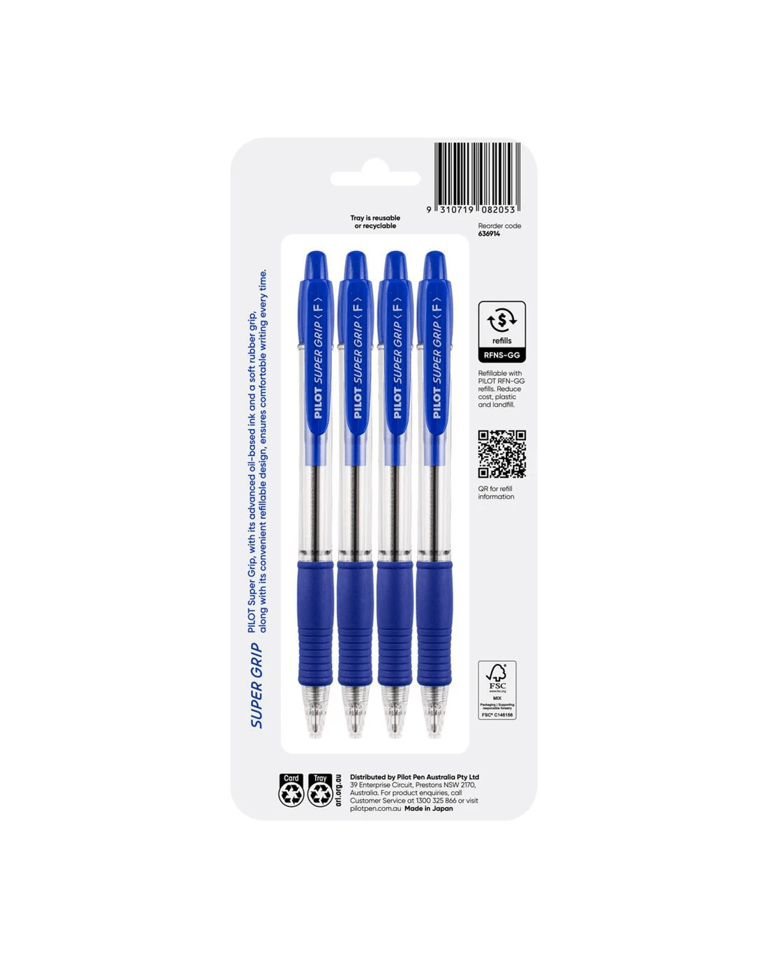 PILOT BPGP10R Super Grip Retractable Ballpoint Pen 0.7mm Blue 4 Pack is perfect for students and professionals who write often. The medium tip creates bold, clear lines, ideal for notes and journaling. A soft rubber grip offers added comfort and helps reduce hand fatigue during long writing sessions. The smooth, oil-based Blue ink delivers consistent, skip-free writing every time. This pack contains four Blue pens. Each pen is refillable with PILOT RFNS-GG refills, making it a cost-effective choice.