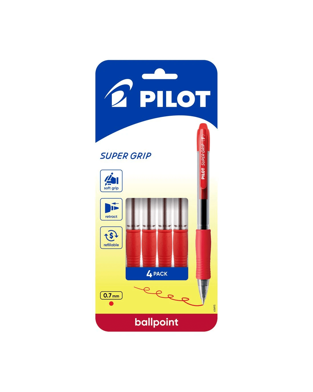 PILOT BPGP10R Super Grip Retractable Ballpoint Pen 0.7mm Red 4 Pack is perfect for students and professionals who write often. The medium tip creates bold, clear lines, ideal for notes and journaling. A soft rubber grip offers added comfort and helps reduce hand fatigue during long writing sessions. The smooth, oil-based Red ink delivers consistent, skip-free writing every time. This pack contains four Red pens. Each pen is refillable with PILOT RFNS-GG refills, making it a cost-effective choice.