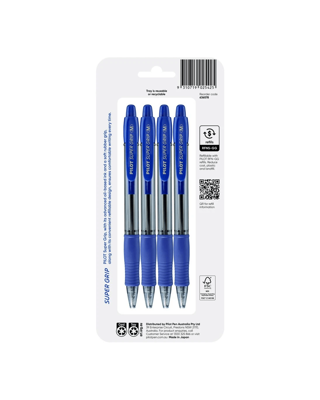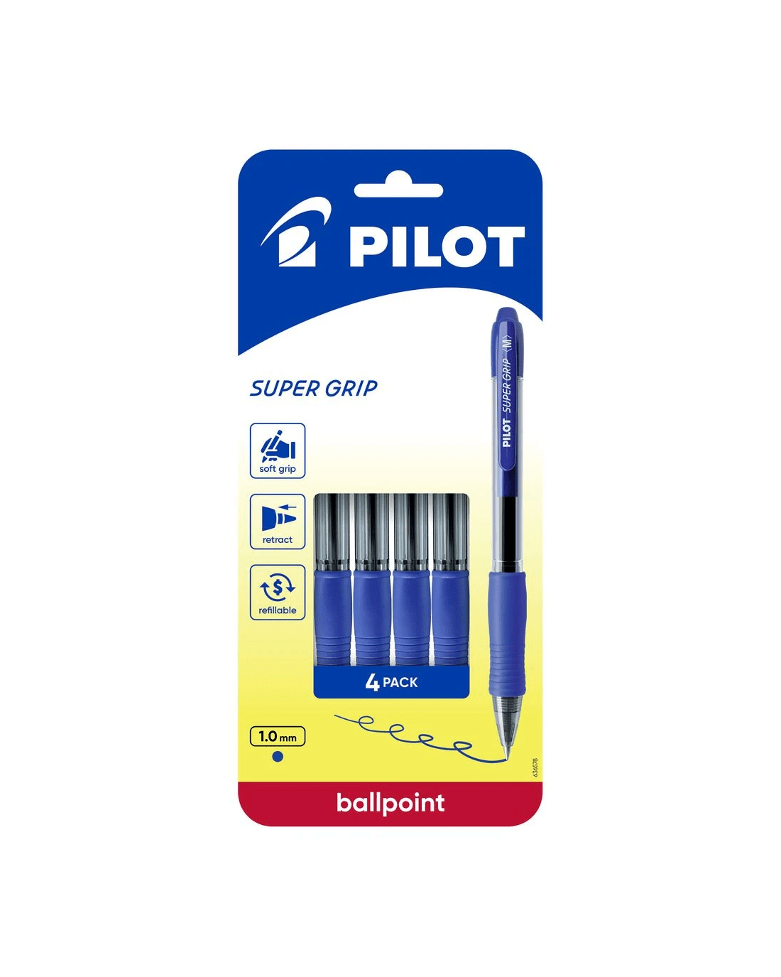 PILOT BPGP10R Super Grip Retractable Ballpoint Pen Medium 1mm Blue 4 Pack is perfect for students and professionals who write often. The medium tip creates bold, clear lines, ideal for notes and journaling. A soft rubber grip offers added comfort and helps reduce hand fatigue during long writing sessions. The smooth, oil-based Blue ink delivers consistent, skip-free writing every time. This pack contains four Blue pens. Each pen is refillable with PILOT RFNS-GG refills, making it a cost-effective choice.