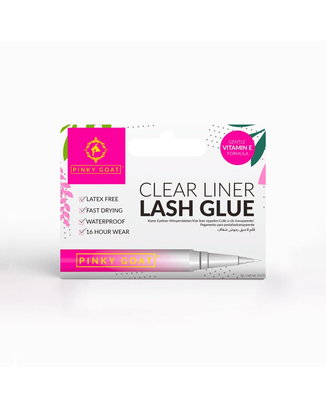 Pinky Goat Clear Liner Lash Glue offers a gentle, latex-free formula that's fast drying and waterproof - this liner lash glue is designed to hold your lashes in place all day long! The eyeliner brush applicator allows for a mess-free, quick and precise application that's perfect for beginners and pros alike. The formula contains vitamin E.