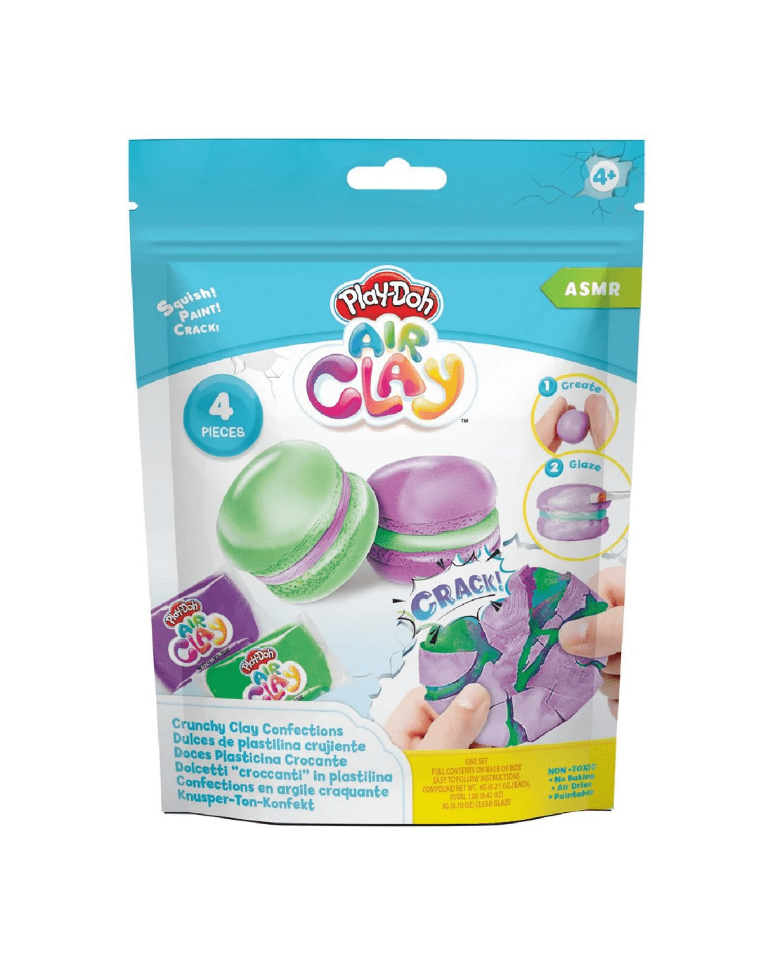 Play-Doh Air Clay Pretend Confections is great for inspiring creative play, stimulating senses and improving hand-eye coordination. This set includes everything you'll need to create your own Crunchy Macaron including 2 packets of purple and green Air Clay and some special textured pieces to make the pretend cupcakes crunch while they're being made. Plus, thanks to Play-Doh Air Clay's special design, you can proudly display your creations once you're finished.