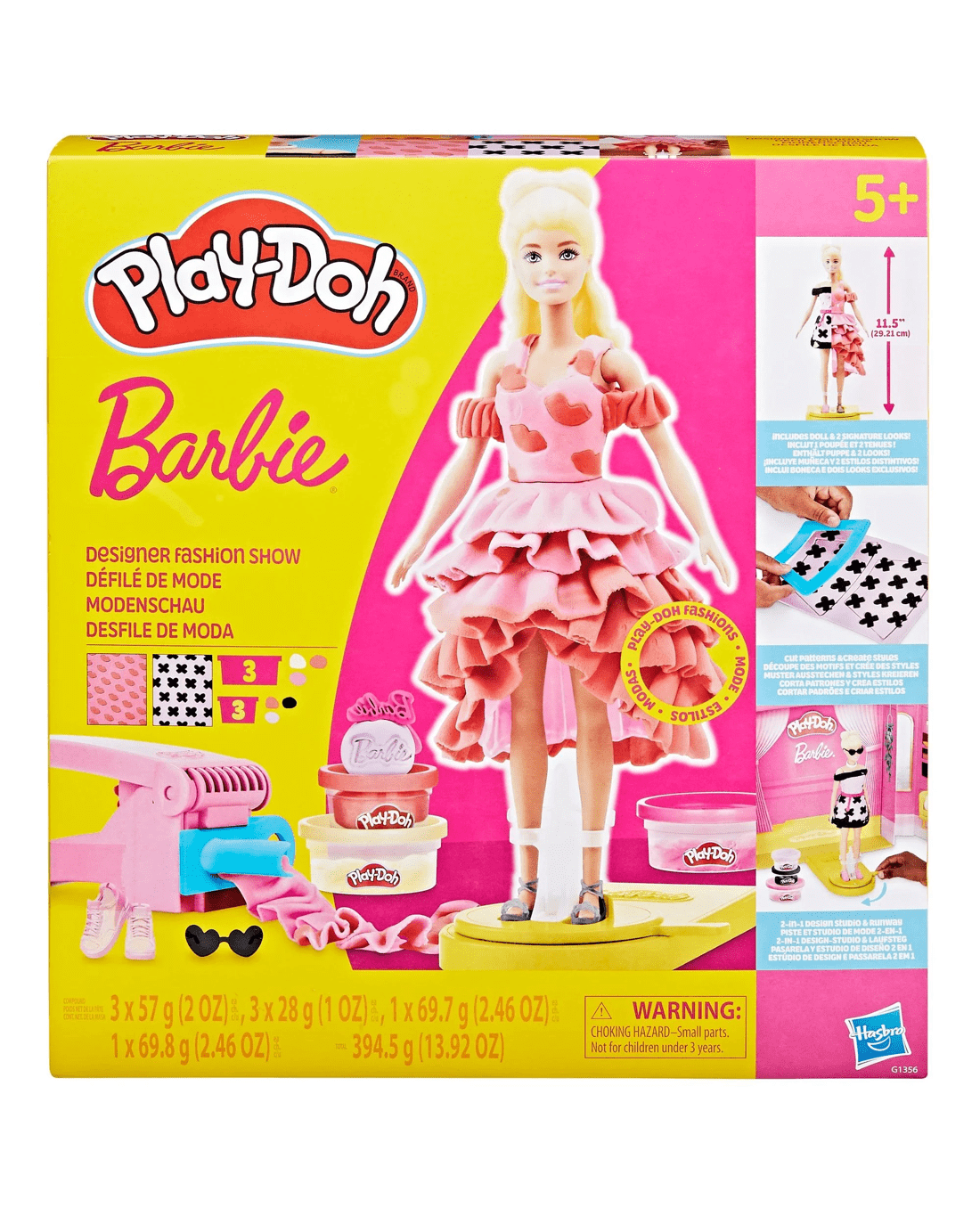 - Includes Barbie doll, runway playset, doll stand, ruffle maker with 2 rails, 2 hair molds, 2 underskirts, Barbie logo stamper, 2 cutters, bow stamper, 2-sided stamper, rolling stamper, necklace accessory, 2 pairs of shoes, belt, sunglasses, knife, roller, 2 Play-Doh Pattern sheets, and 5 cans of Play-Doh Brand Modeling Compound (total 13.92 oz/394.5 g).