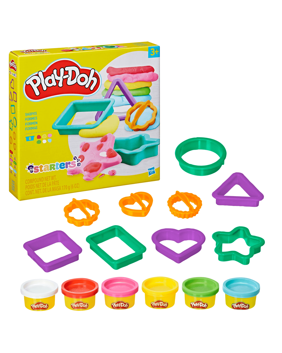 - Shapes: 6 x cans of Play-Doh Brand Modeling Compound and 9 x shape cutters