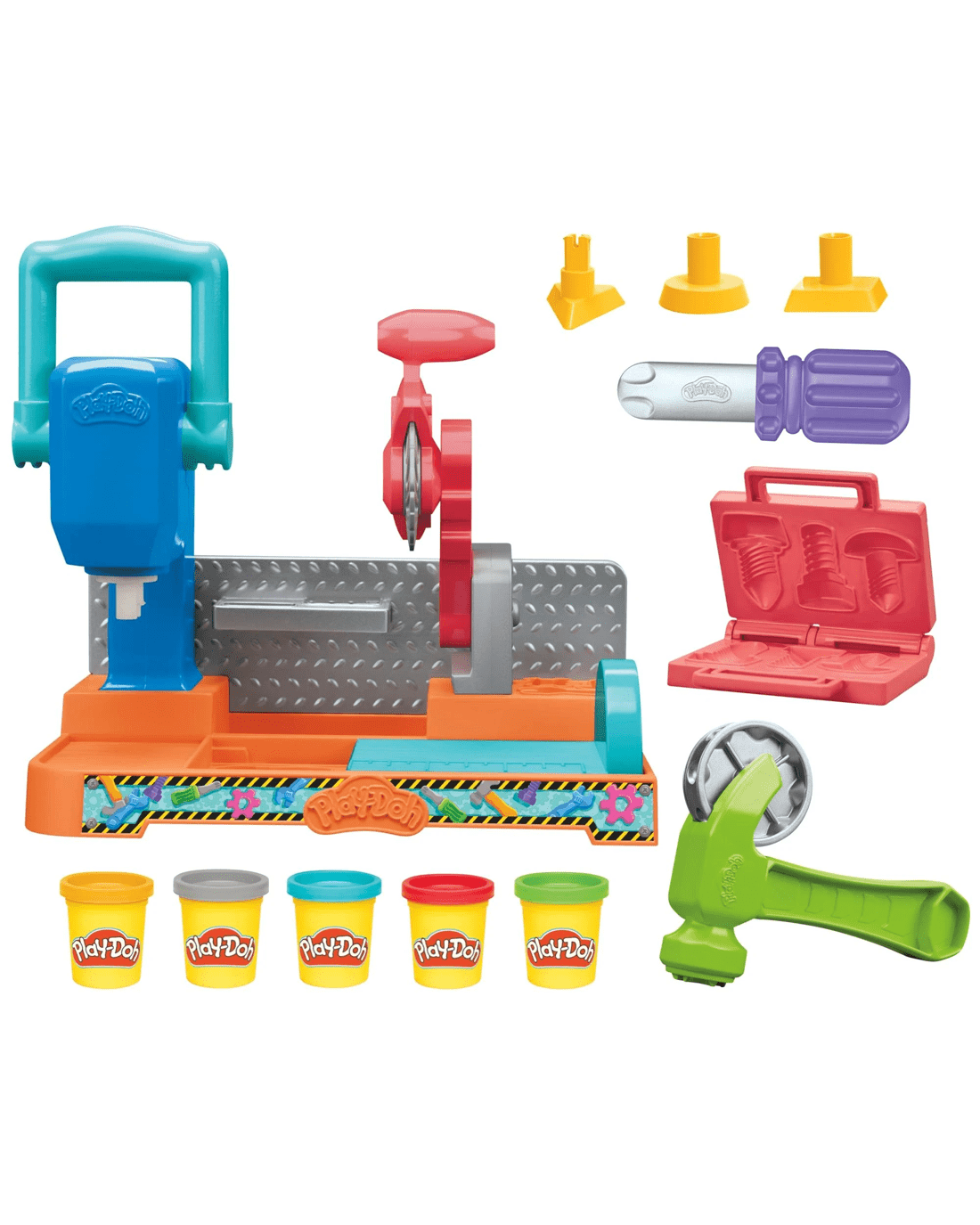 • Includes: tool bench playset, 3 stamper attachments, toolbox book-mold, toy screwdriver, rolling hammer stamper, and 5 cans of Play-Doh Brand Modeling Compound (2 ounces/56 grams per can).