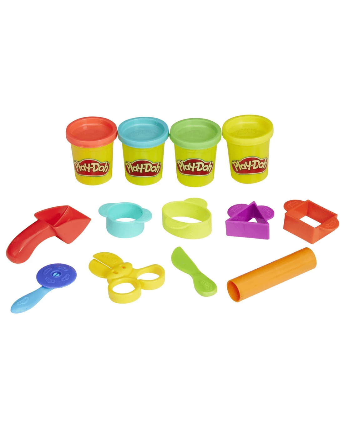 - Includes storage tote, 4 shape cutters, roller, scissors, plastic knife, rolling cutter, embossing tool, and 4 cans of Play-Doh Brand Modelling Compound