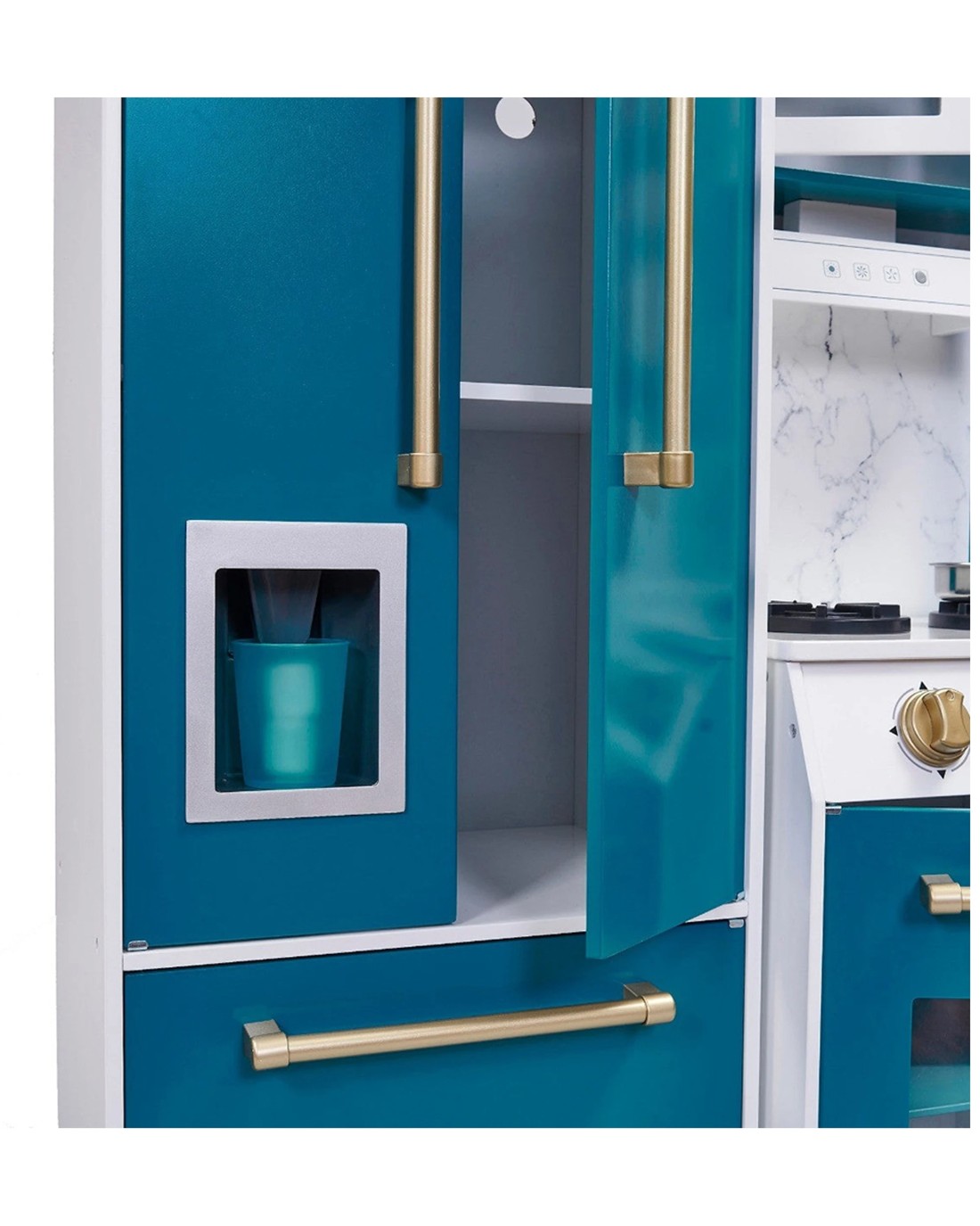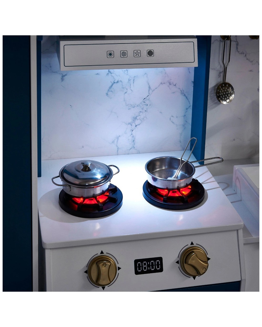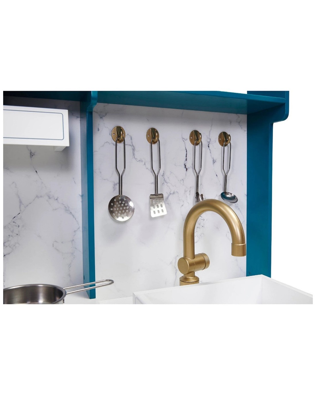The modular fridge freezer with a shelf offers ample space for groceries or pretend food storage, and the included stainless-steel utensils, pots, pans, hooks, and towel rail help inspire creative storytelling and kitchen play. The oxford blue exterior, brass accents, and imitation marbled backsplash give the kitchen a stylish, classic look that suits any playroom decor.