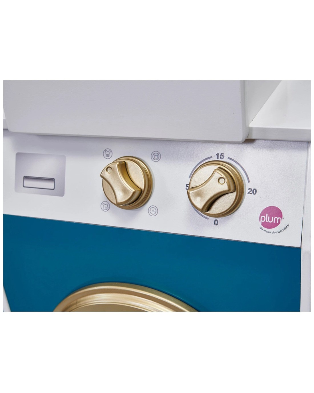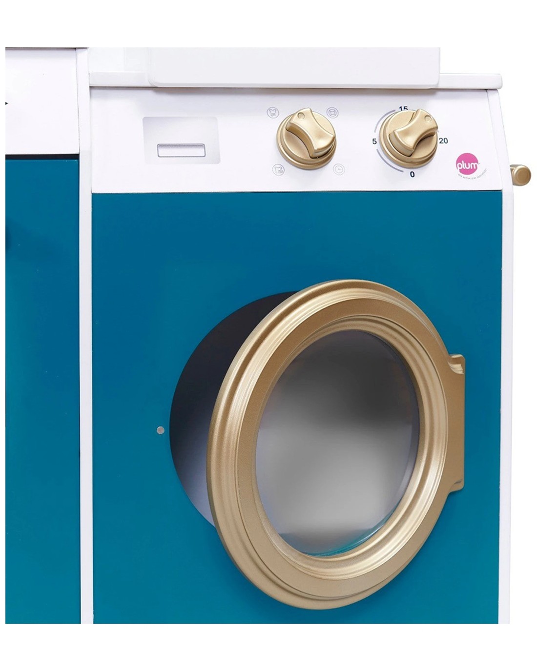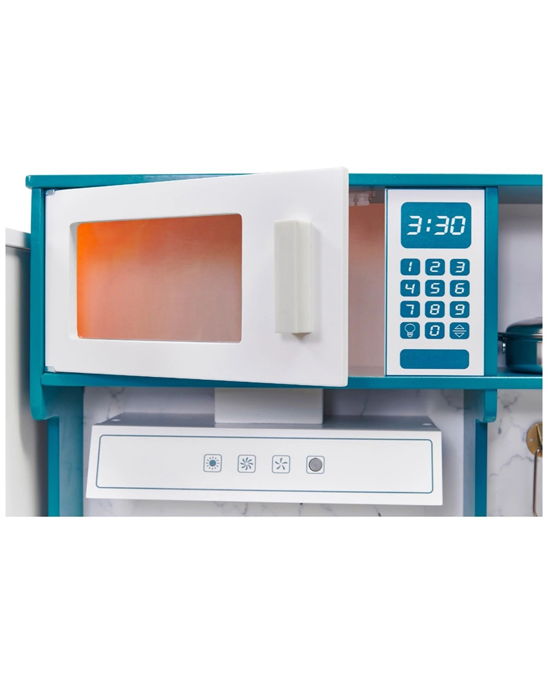The modular fridge freezer with a shelf offers ample space for groceries or pretend food storage, and the included stainless-steel utensils, pots, pans, hooks, and towel rail help inspire creative storytelling and kitchen play. The oxford blue exterior, brass accents, and imitation marbled backsplash give the kitchen a stylish, classic look that suits any playroom decor.