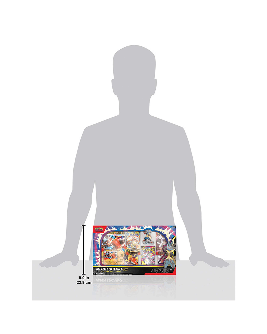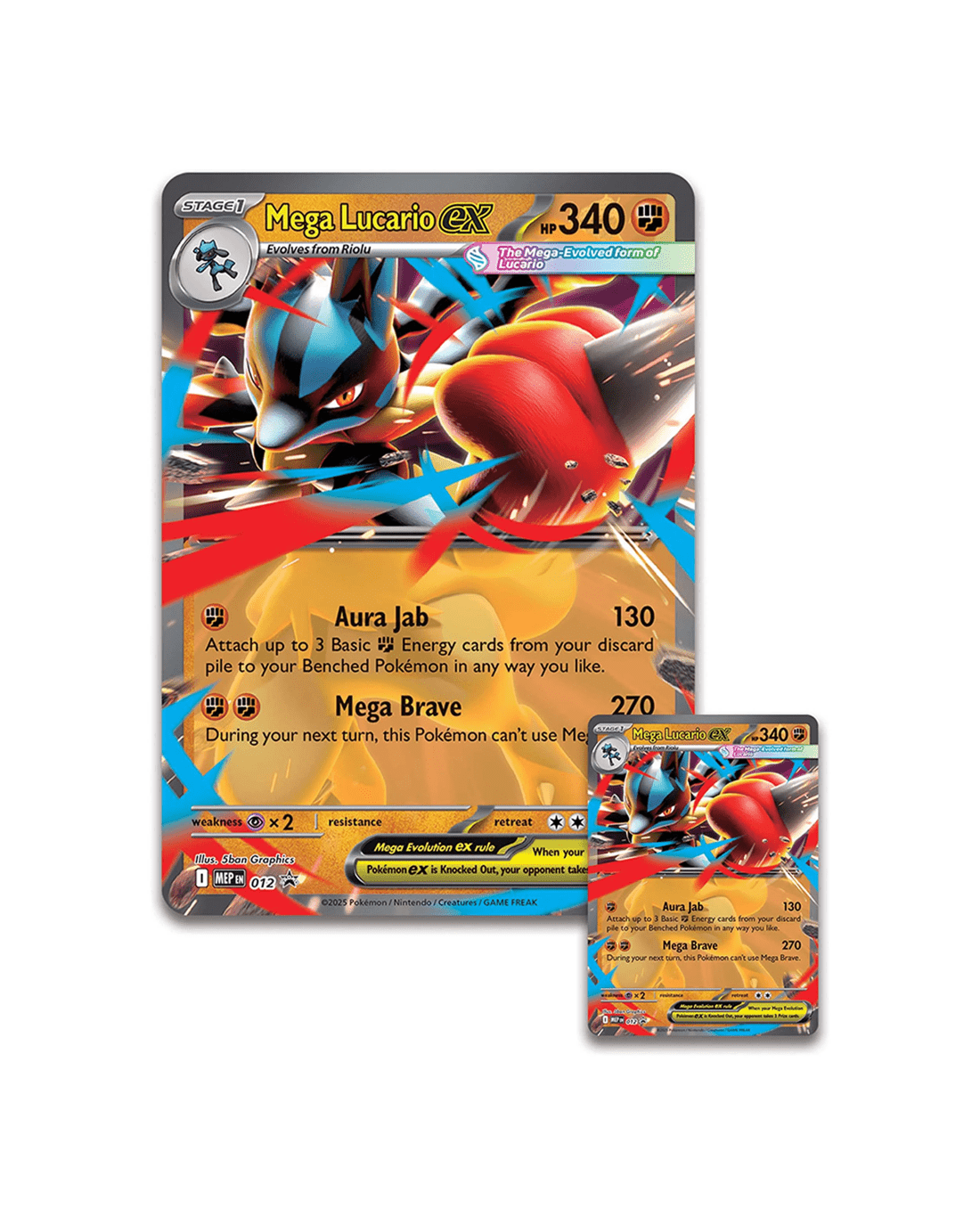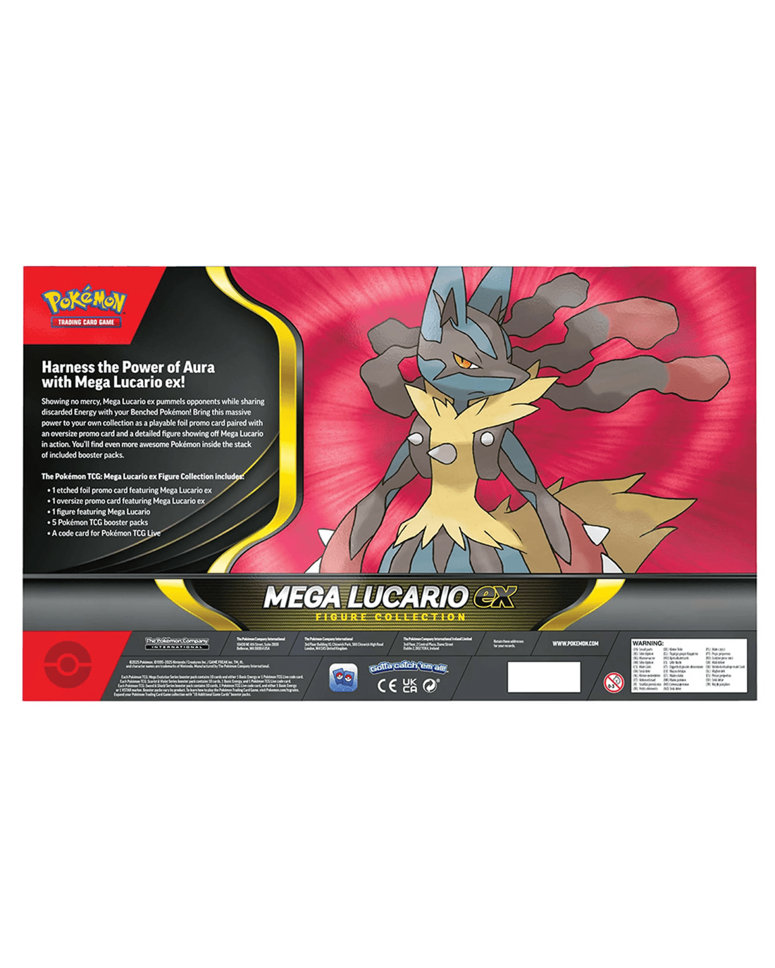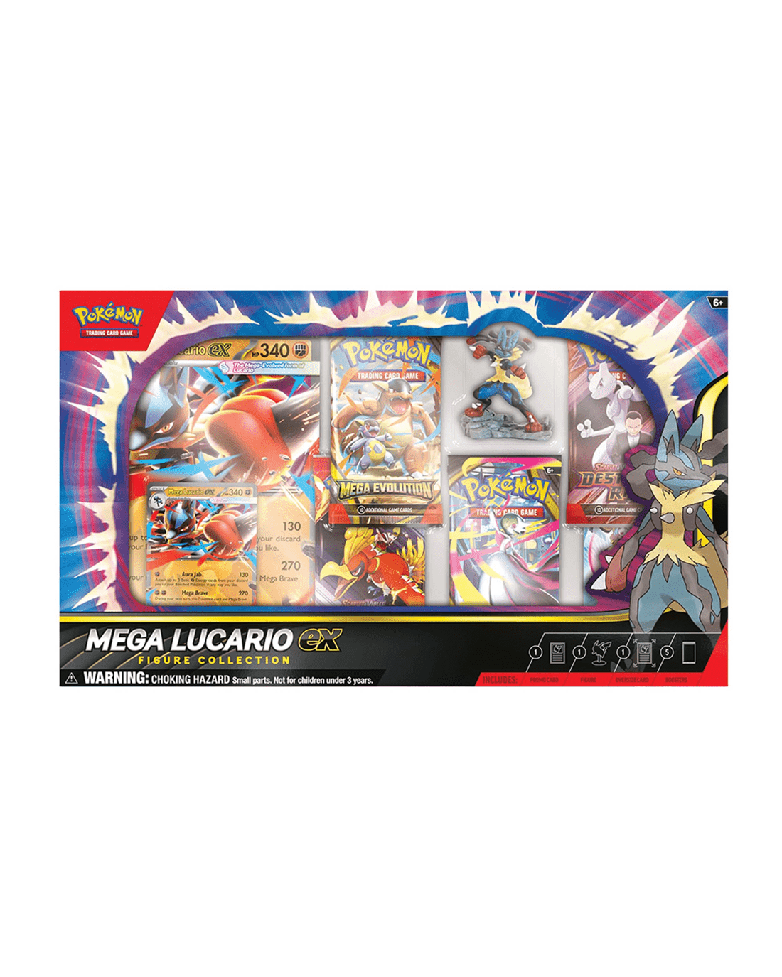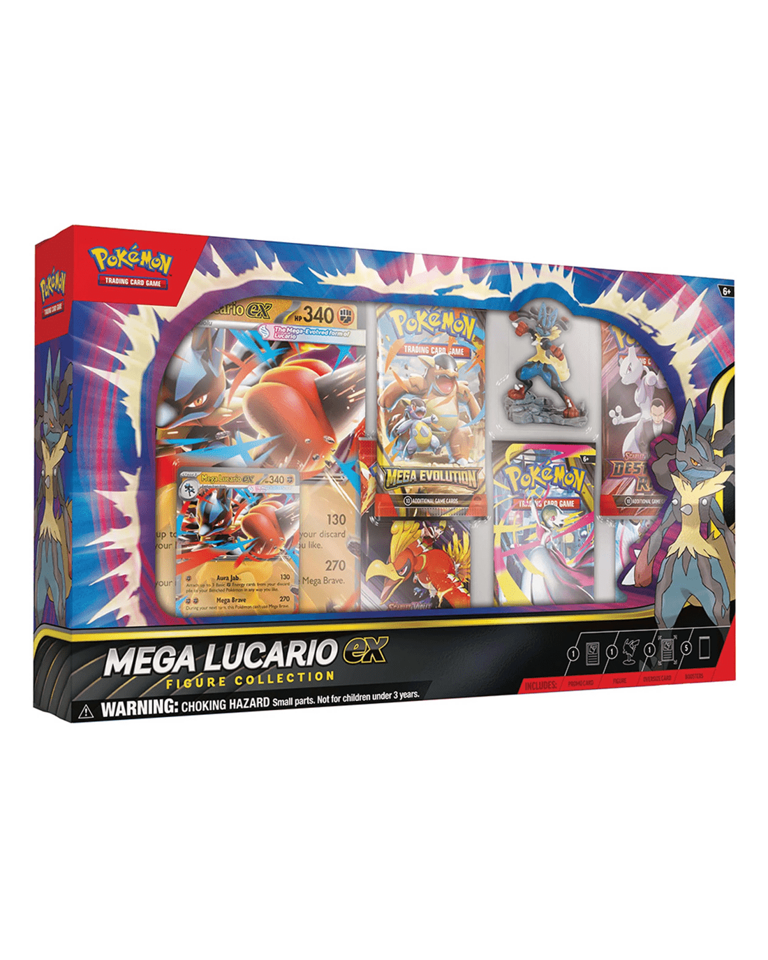 • Includes 1 x etched foil promo card featuring Mega Lucario ex, 1 x oversize promo card featuring Mega Lucario ex, 1 x figure featuring Mega Lucario, 5 x Pokemon TCG booster packs and 1 x code card for Pokemon TCG Live