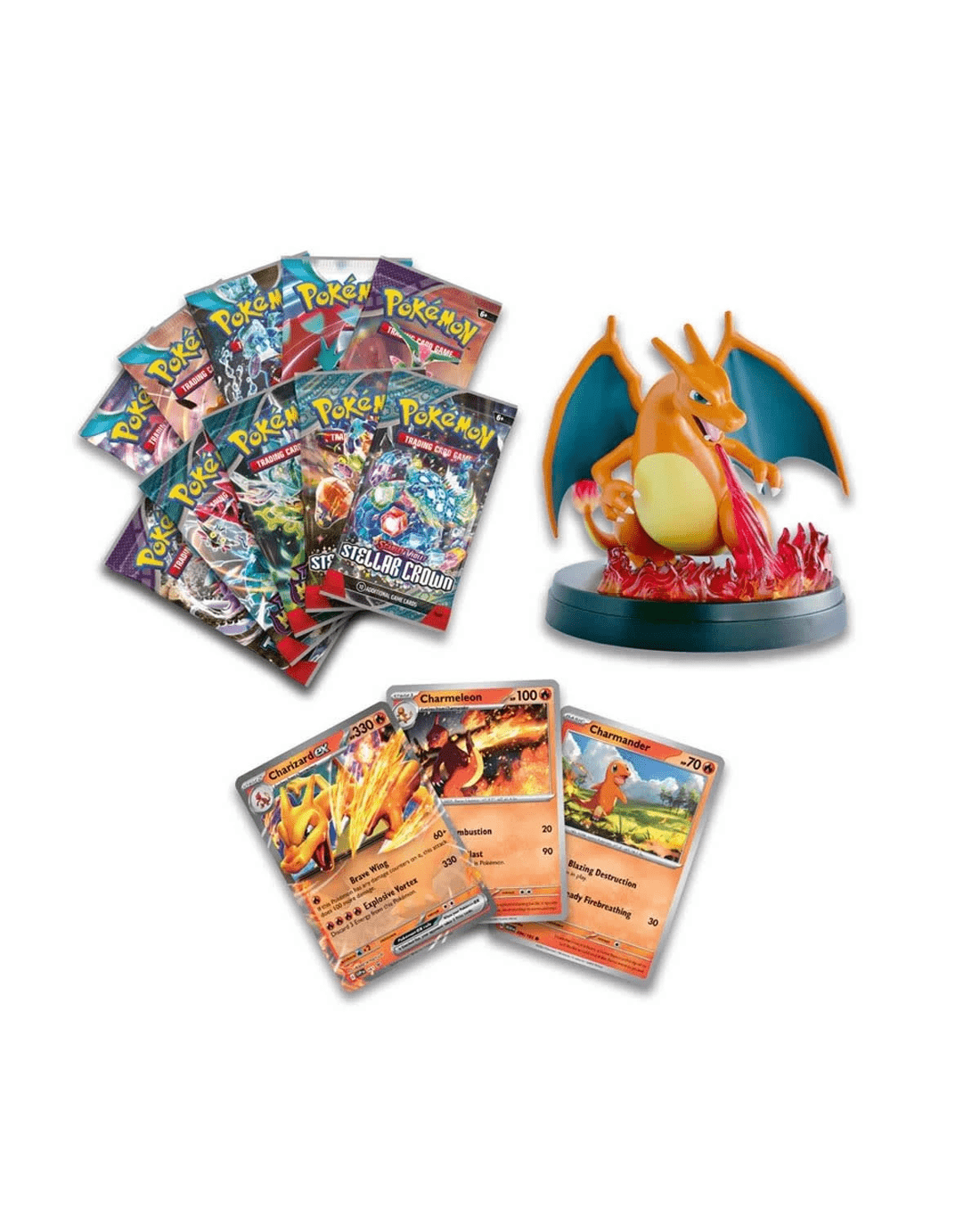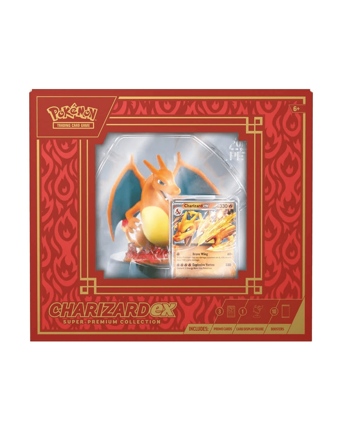 - Includes The Pokemon TCG: Charizard ex Super-Premium Collection includes: 1 x foil promo card featuring Charizard ex, 2 x foil cards featuring Charmander and Charmeleon, 1 x card-display figure featuring Charizard and 10 x Pokemon TCG booster packs