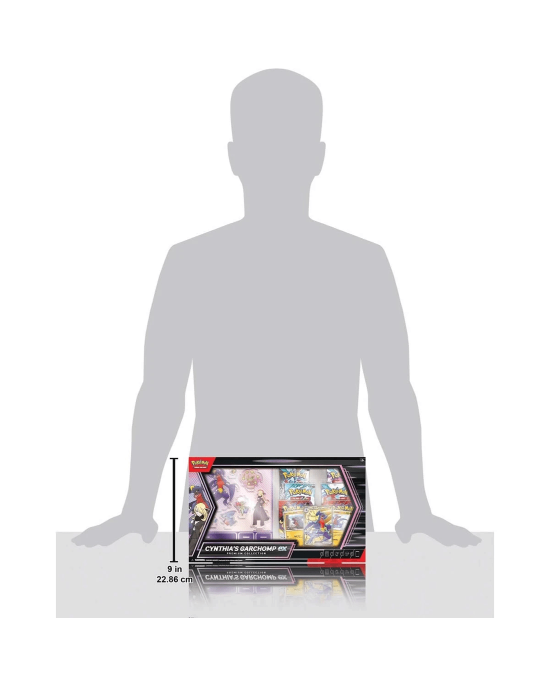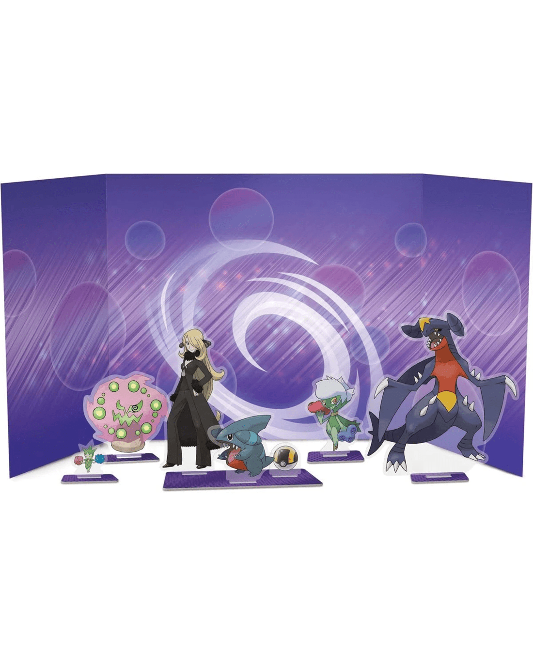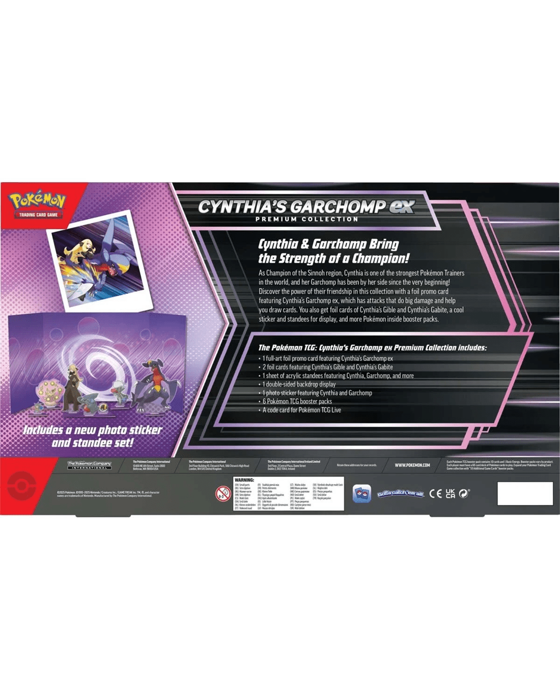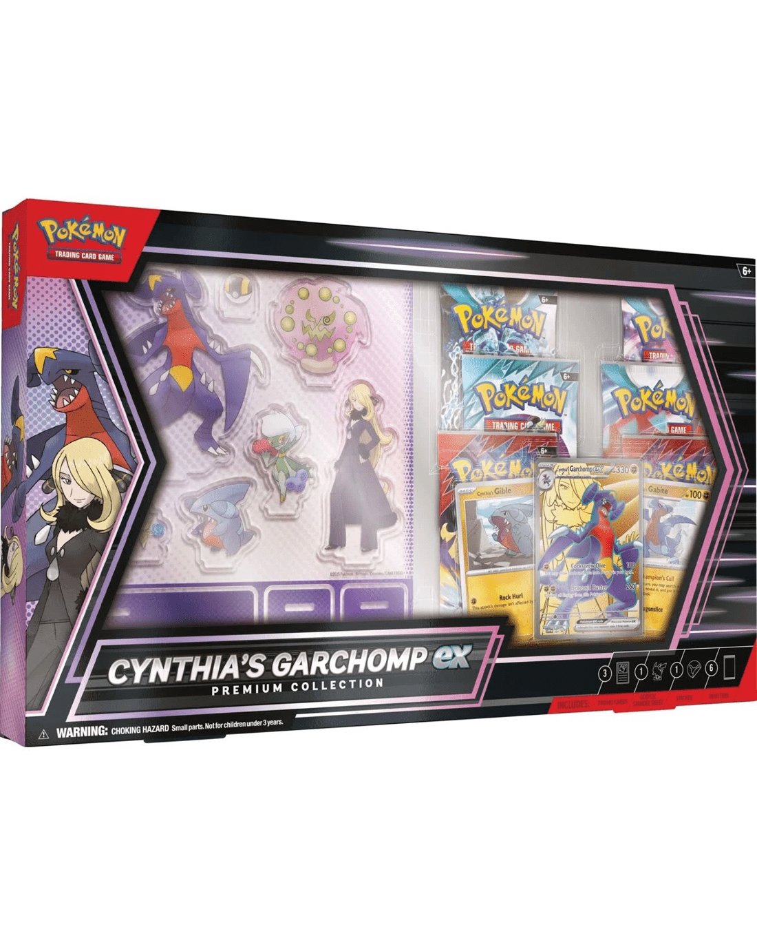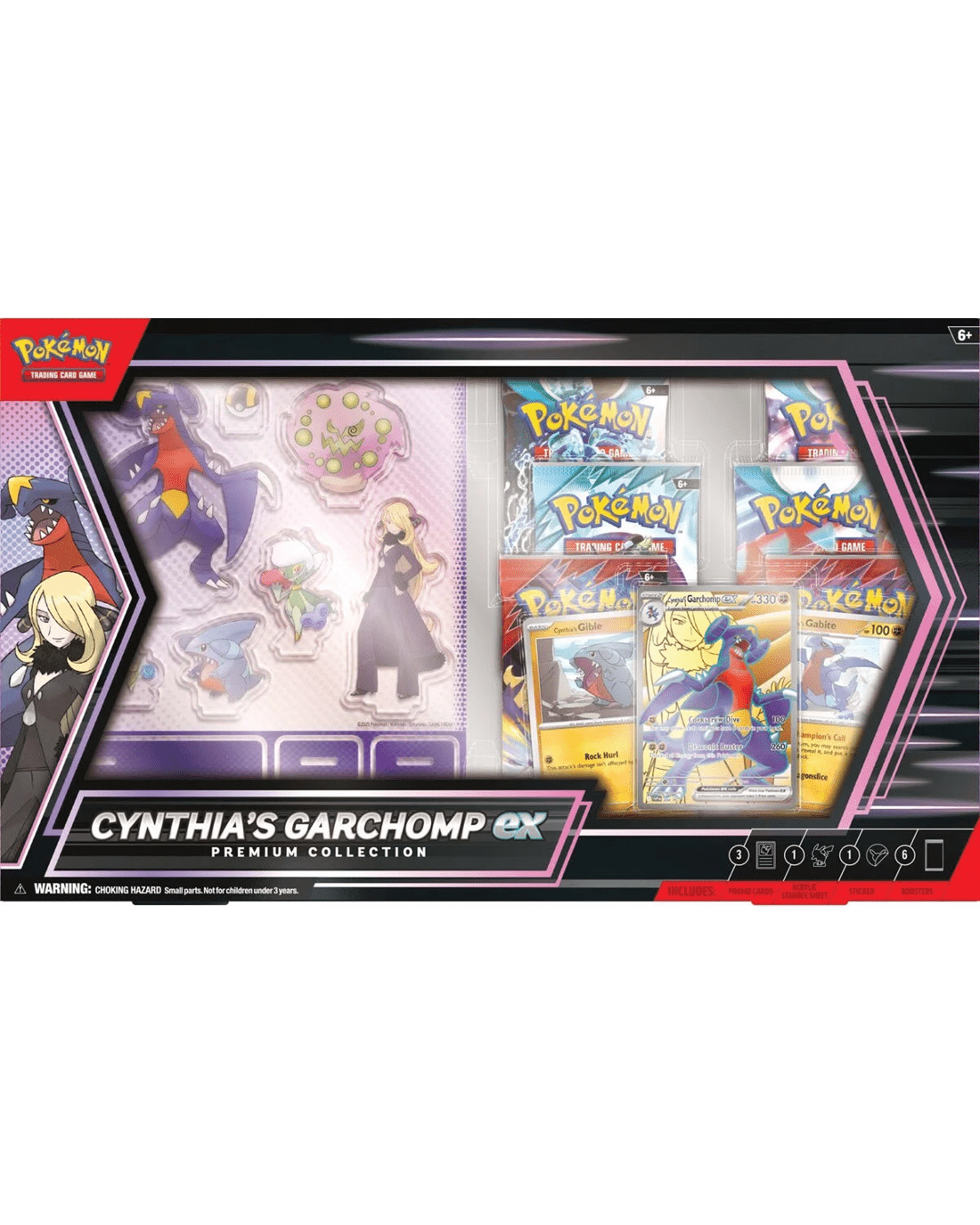 - Includes 1 x full-art foil promo card featuring Cynthia's Garchomp ex, 2 x foil cards featuring Cynthia's Gible and Cynthia's Gabite, 1 x sheet of acrylic standees featuring Cynthia, Garchomp and more 1 x double-sided backdrop display, 1 x photo sticker featuring Cynthia and Garchomp, 6 x Pokemon TCG booster packs and 1 x code card for Pokemon TCG Live