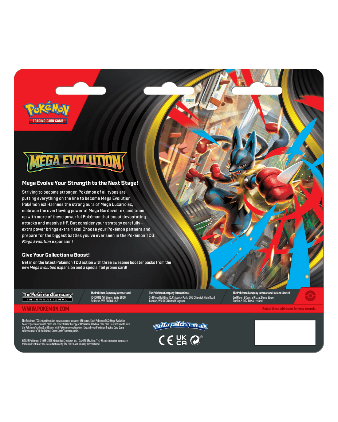 - Blister pack includes 3 x Pokemon Trading Card Game: Mega Evolution Booster Packs, plus 1 x Promo Card