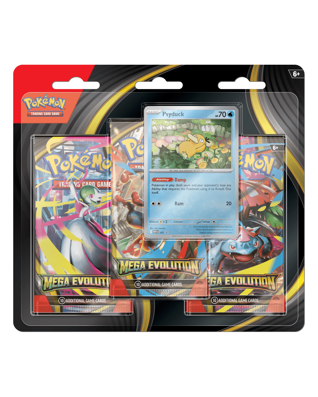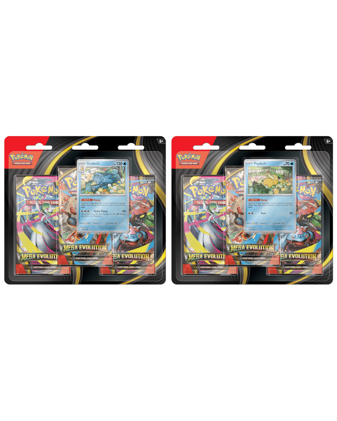 Each Pokemon TCG: Mega Evolution Three-Booster Blister includes three awesome booster packs from the new Mega Evolution expansion, plus 1 Promo Card of either Golduck or Psyduck.
