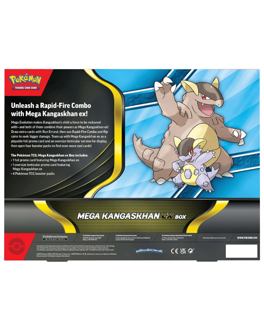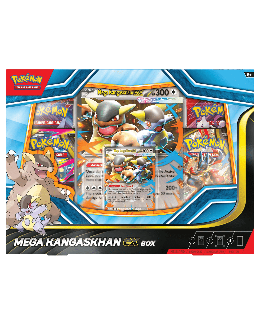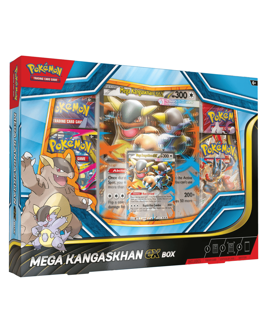- Includes 1 x foil promo card featuring Mega Kangaskhan ex, 1 x oversize lenticular promo card featuring Mega Kangaskhan ex and 4 x Pokemon TCG booster packs