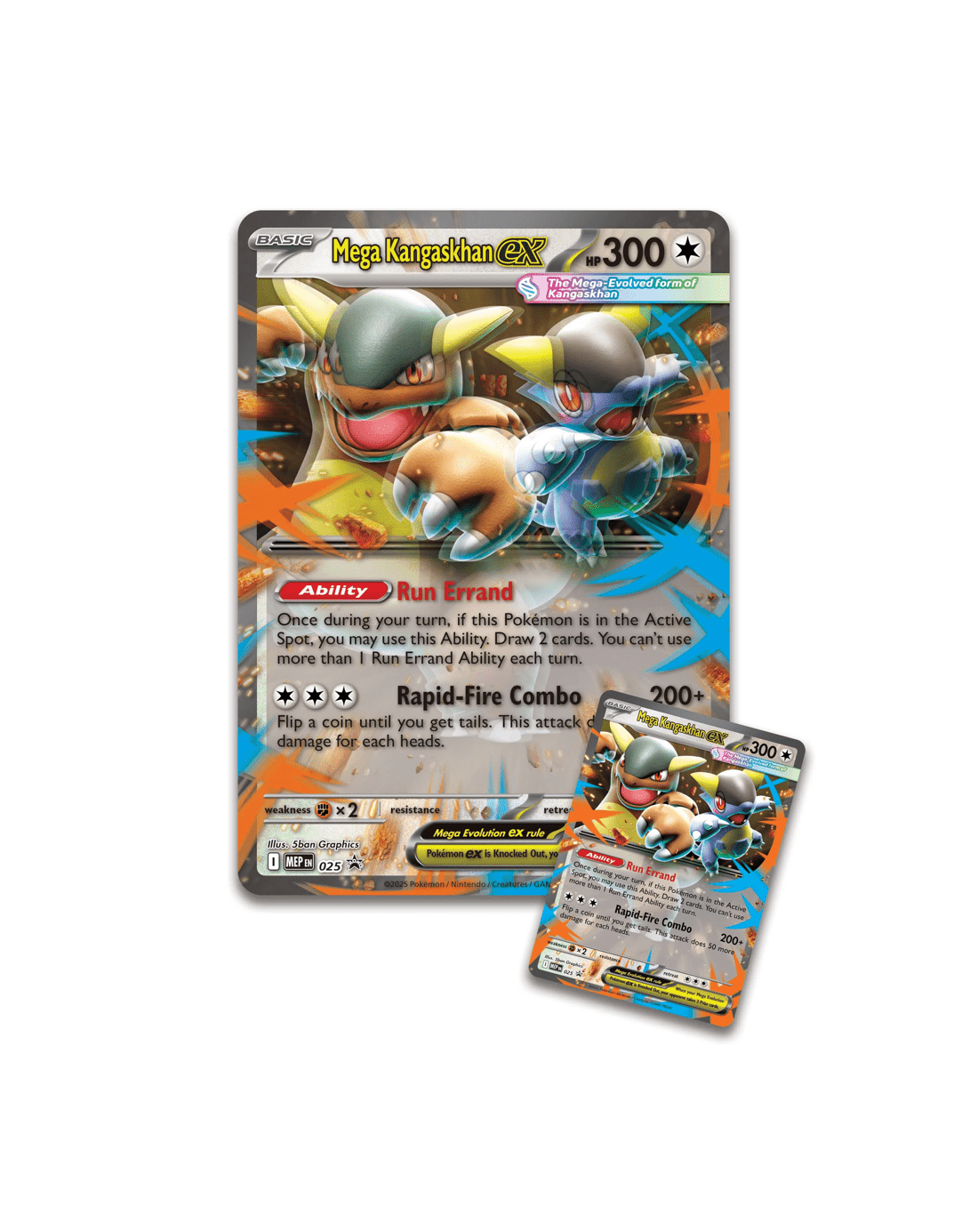 Mega Evolution makes Kangaskhan's child a force to be reckoned with and both of them combine their powers as Mega Kangaskhan ex! Draw extra cards with Run Errand, then use Rapid-Fire Combo and flip coins to seek bigger damage. Team up with Mega Kangaskhan ex as a playable foil promo card and an oversize lenticular version for display, then open four booster packs to find even more cool cards!