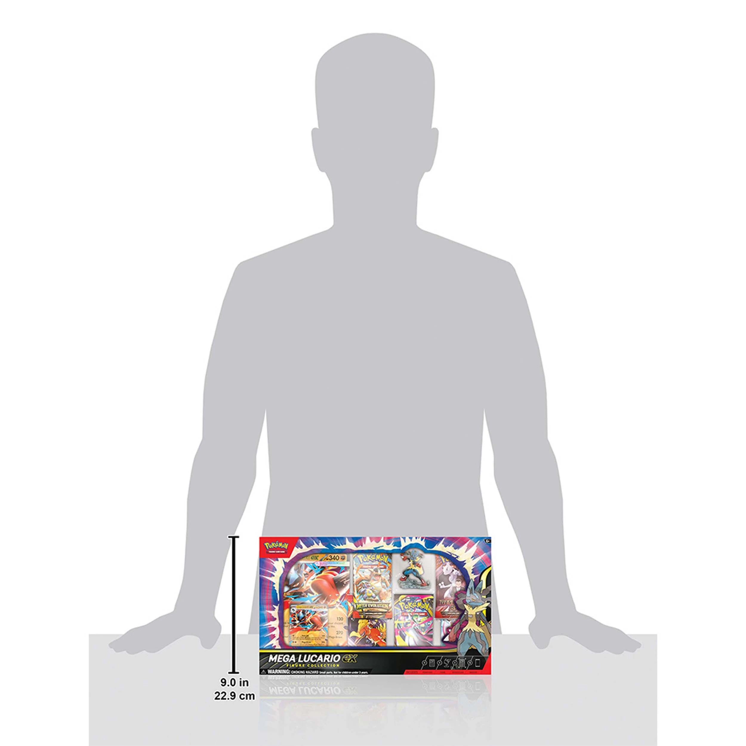 - Includes 1 x etched foil promo card featuring Mega Lucario ex, 1 x oversize promo card featuring Mega Lucario ex, 1 x figure featuring Mega Lucario, 5 x Pokemon TCG booster packs and 1 x code card for Pokemon TCG Live