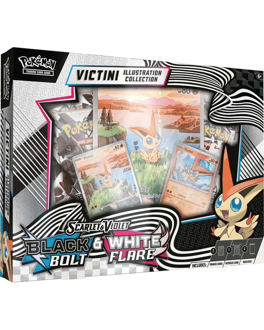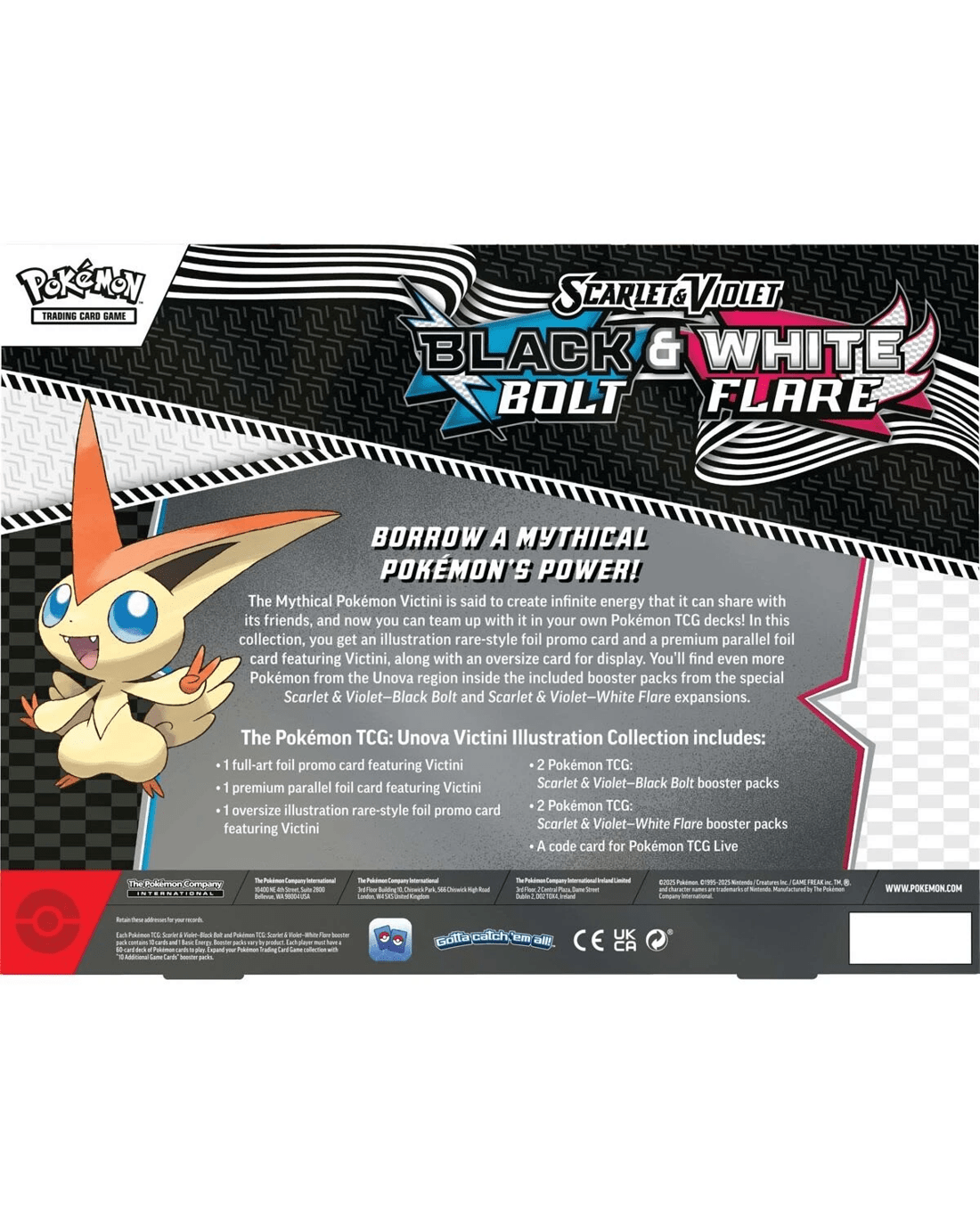 - Includes 1 x full-art foil promo card featuring Victini, 1 x premium parallel foil card featuring Victini, 1 x oversize illustration rare-style foil promo card featuring Victini, 2 x Pokemon TCG: Scarlet & Violet - Black Bolt booster packs and 2 x Pokemon TCG: Scarlet & Violet - White Flare booster packs and 1 x code card for Pokemon TCG Live