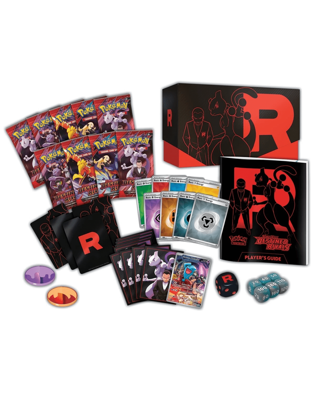 - Includes 9 x Pokemon TCG: Scarlet and Violet - Destined Rivals booster packs, 1 x full-art foil promo card featuring Team Rocket’s Wobbuffet, 65 x card sleeves, 45 x Pokemon TCG energy cards, 1 x player’s guide to the Scarlet and Violet - Destined Rivals expansion, 6 x damage-counter dice, 1 x competition-legal coin-flip die, 2 x plastic condition markers, 1 x collector’s box to hold everything, with 4 dividers to keep it organised and 1 x code card for Pokemon Trading Card Game live