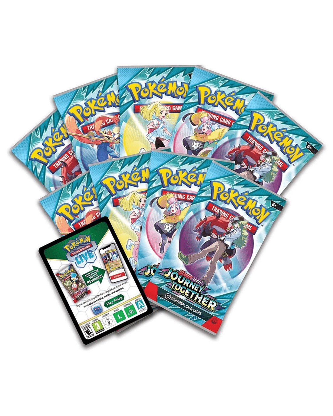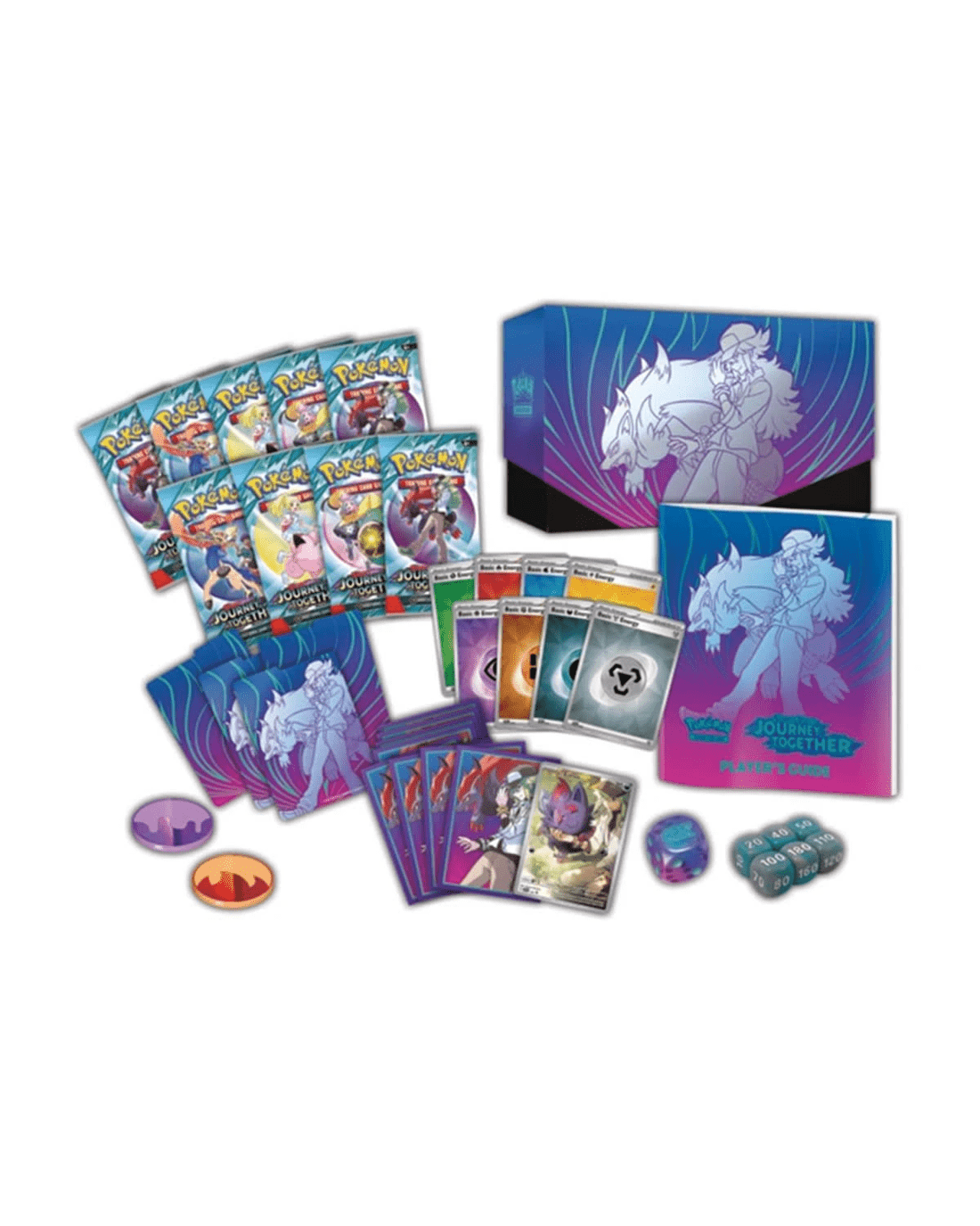 - Includes 9 x Pokemon TCG: Scarlet & Violet Journey Together booster packs, 1 x full-art foil promo card featuring N’s Zorua, 65 x card sleeves, 45 x Pokemon TCG Energy cards, 1 x player’s guide to the Scarlet & Violet Journey Together expansion, 6 x damage-counter dice, 1 x competition-legal coin-flip die, 2 x plastic condition markers, 1 x collector’s box to hold everything with 4 x dividers to keep it organised and 1 x code card for Pokemon Trading Card Game Live