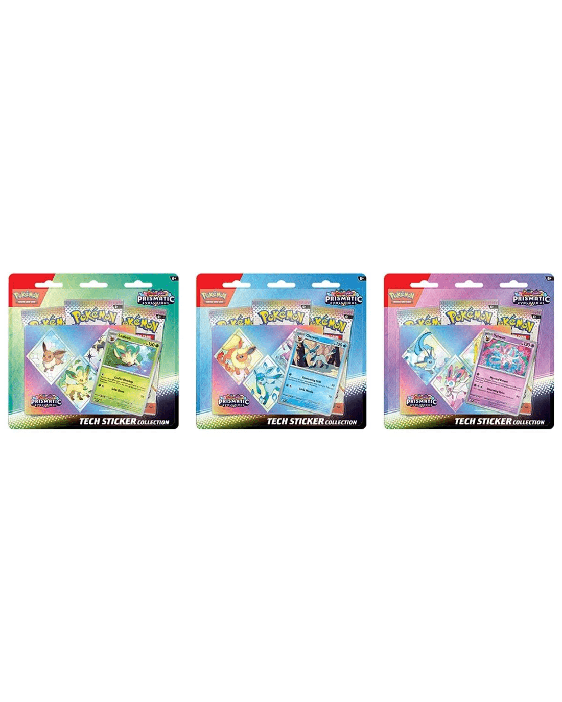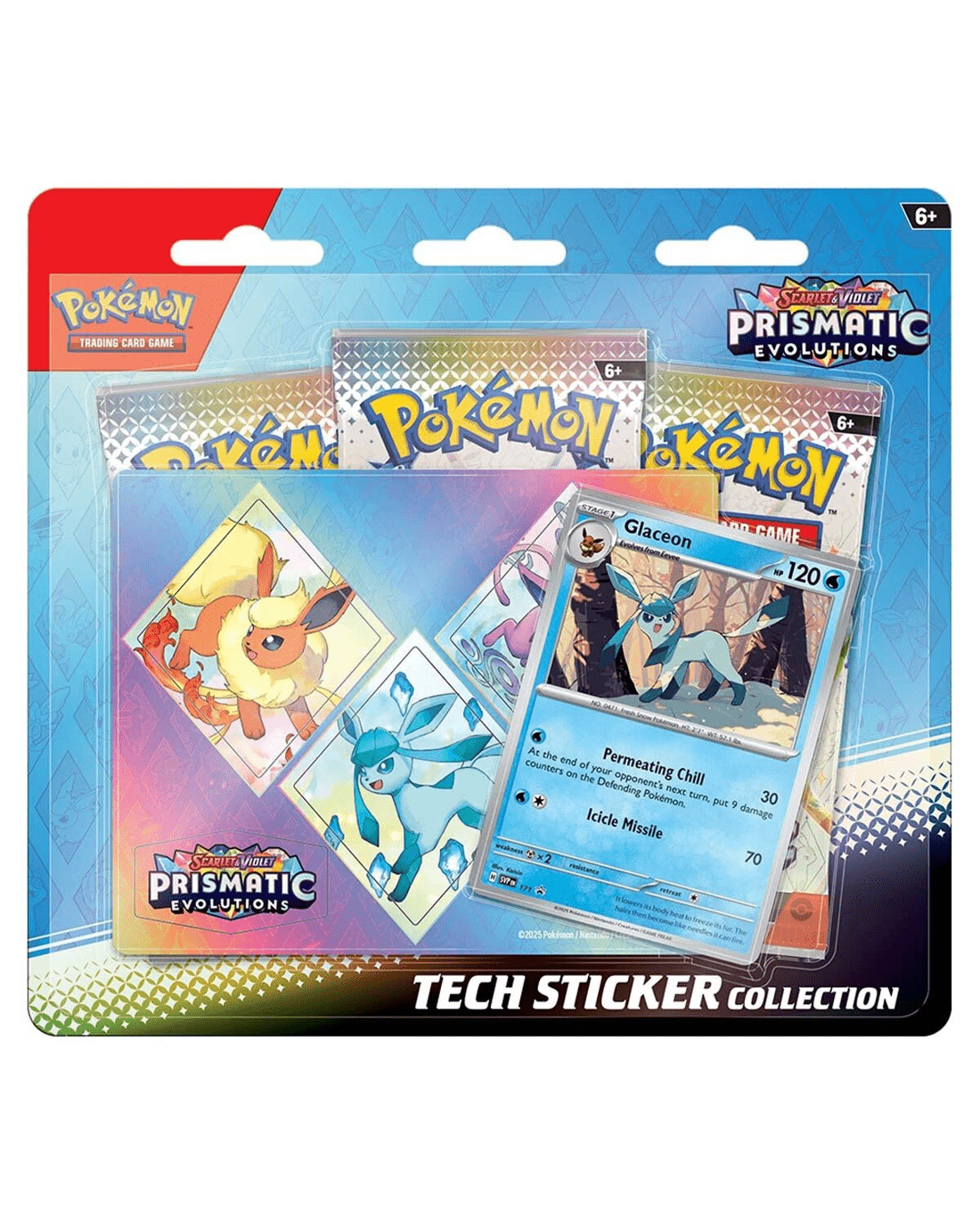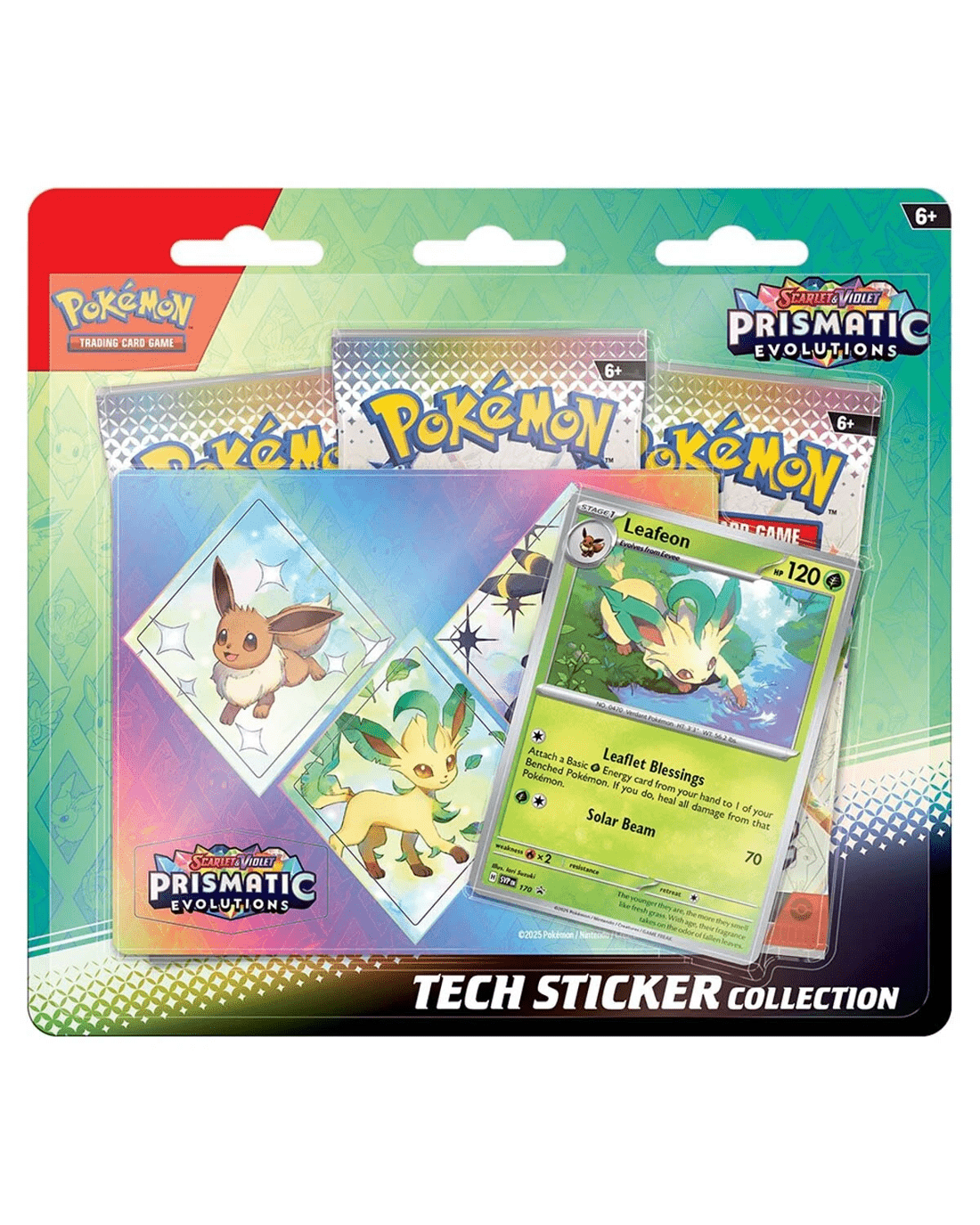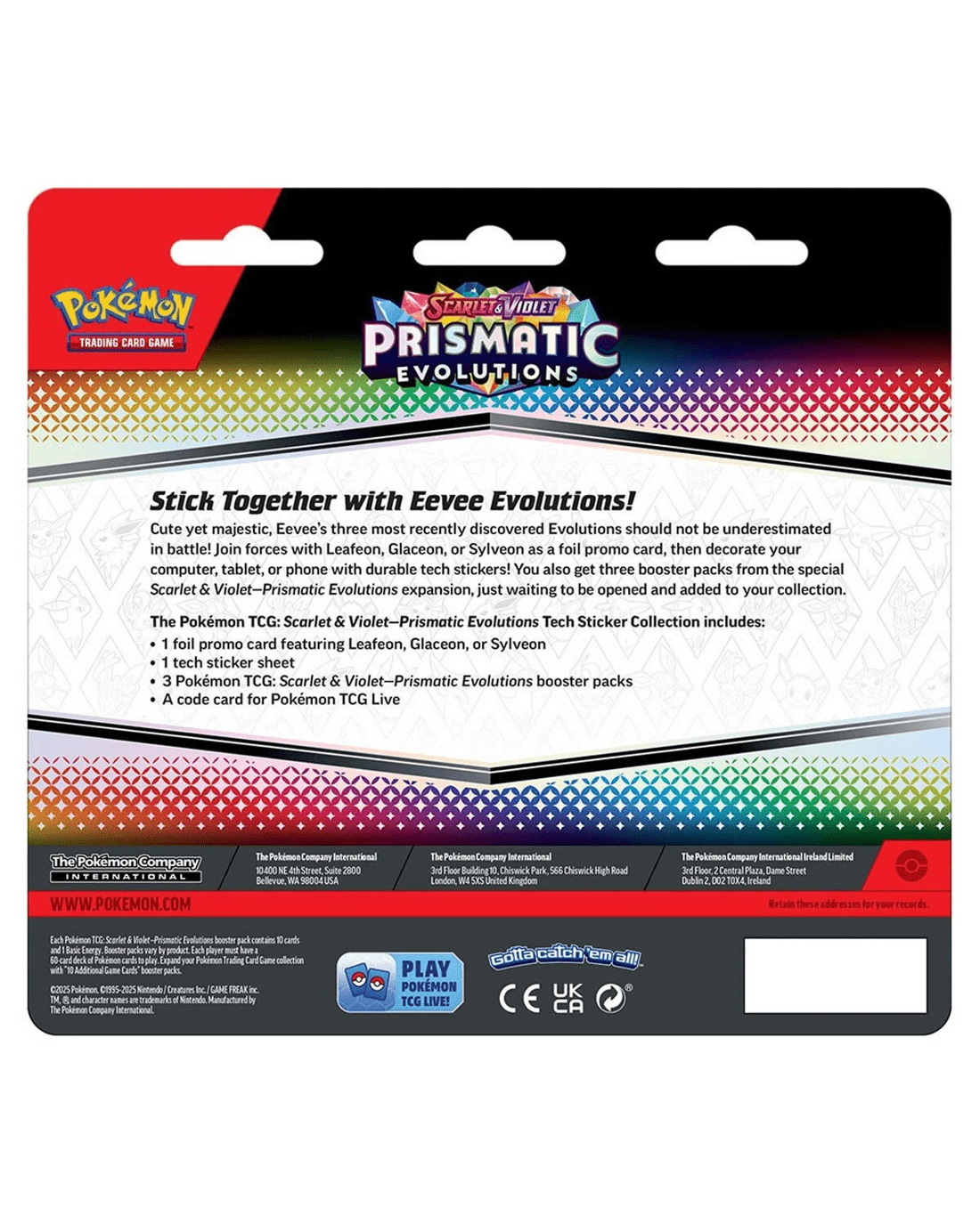 - Includes 1 x foil promo card featuring Leafeon, Glaceon or Sylveon, 1 x tech sticker sheet, 3 x Pokemon TCG: Scarlet & Violet - Prismatic Evolutions booster packs and 1 x code card for Pokemon TCG Live