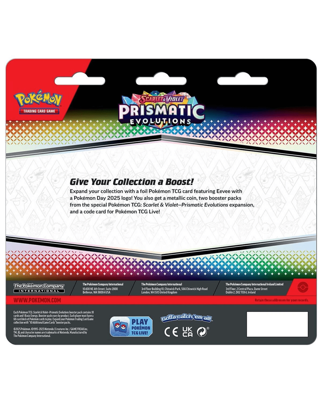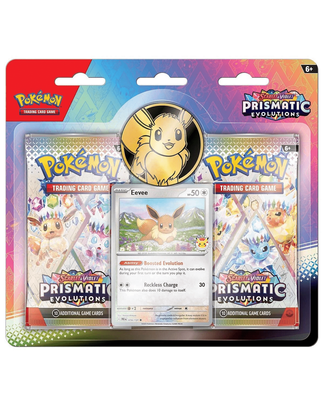Expand your collection with a foil Pokemon TCG featuring Eevee with a Pokemon Day 2025 logo! You also get a metallic coin, two booster packs from the special Pokemon TCG: Scarlet & Violet- Prismatic Evolutions expansion and a code card for Pokemon TCG Live!